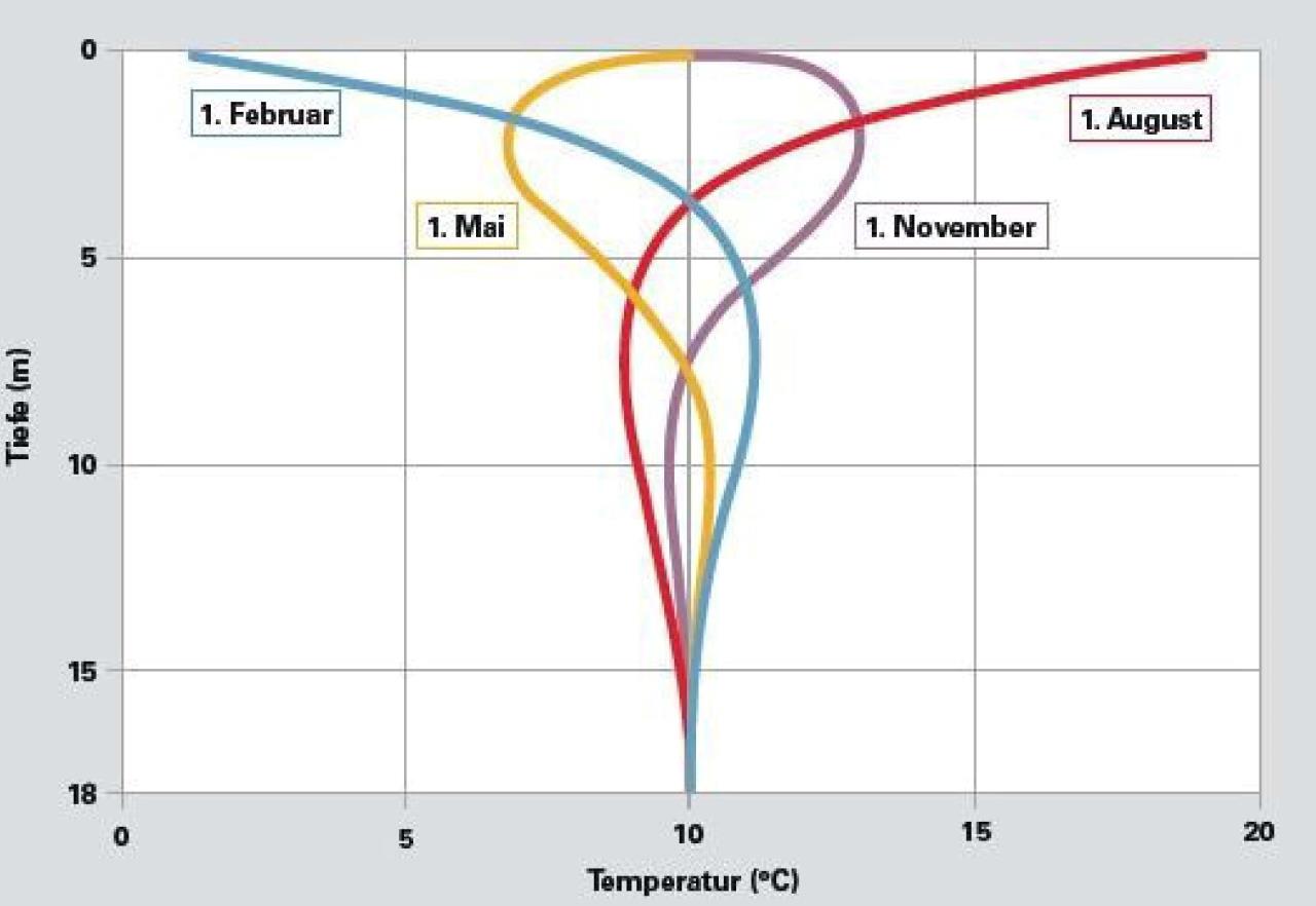 kraweuschuasta schrieb: wenn ich in der Grafik Tiefe über Temperatur bei 2,5m Tiefe eine Waagrechte ziehe, müßt ich ja bei meiner Wasserzuleitung und Wasserzisterne in etwa 2m Tiefe eine über das Jahr schwankende Temperatur zwischen 7 und 15 Grad haben...