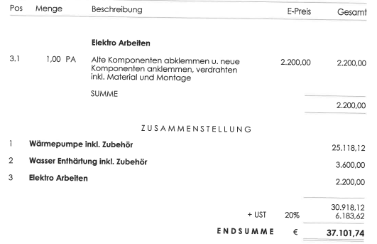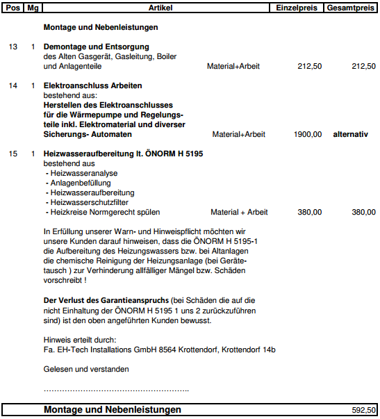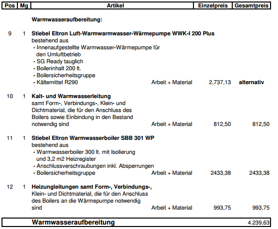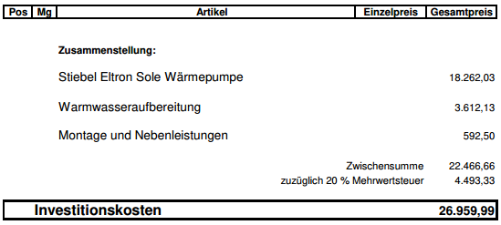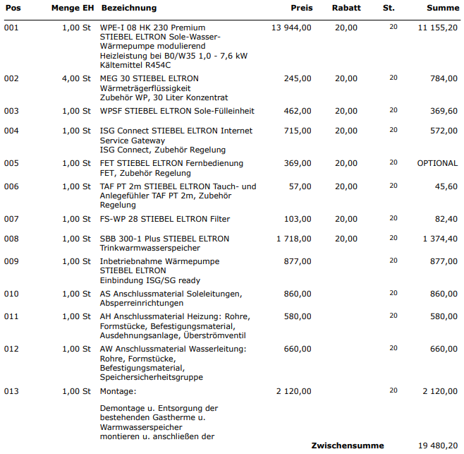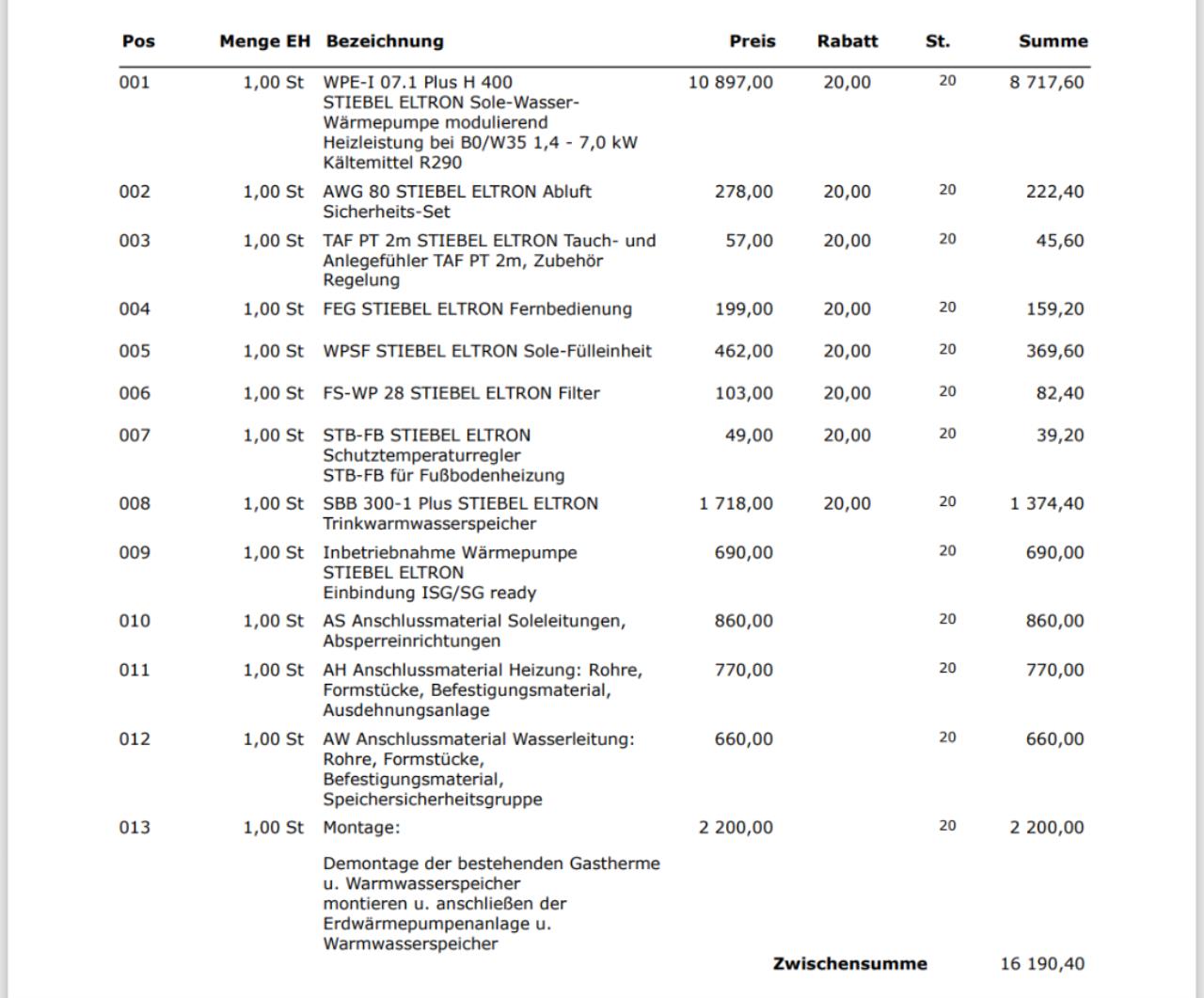 Ja eh, wie oben auch schon erwähnt. Das gilt aber auch für den Heizkreis, da hat er das MAG angboten 😉 Weiters kanns ihn fragen, warum er dir als Stiebel-Partner die WP WP [Wärmepumpe] teuerer verkauft, als der andere. Die 20% Rabatt kommen wahrscheinlich direkt von Stiebel - hat bisher noch jeder bekommen, den ich kenne. Der Installateur vom oberen Angebot hat die vorbildlich an den Kunden weitergegeben, während hier der Verdacht im Raum steht, dass der Installateur die kassieren will. Bei Stiebel gibt es auch ein Angebotsservice. Kannst ja mal schaune, was da für Preise für die Hardware zurück kommen |