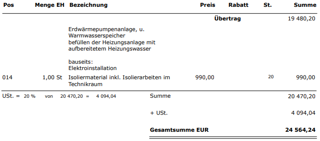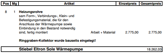 Zweites Angebot zur HK08: Vom "Stiebel Eltron" Installateur. ![]() ![]() ![]() ![]() ![]() Die Isolierarbeiten werden von einer anderen Firma gemacht, für Sole in Kautschuk und Heizungsleitungen. in Steinwolle mit Alu-Kaschierung. Passt das so? Auf die Frage, ob er sich statt es MEGs eine SoleVase vorsatellen könne kam: "Bei den Premium Geräten ist das Solegefäss bereits eingebaut." GLG Daniel |