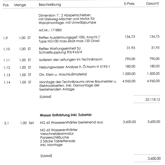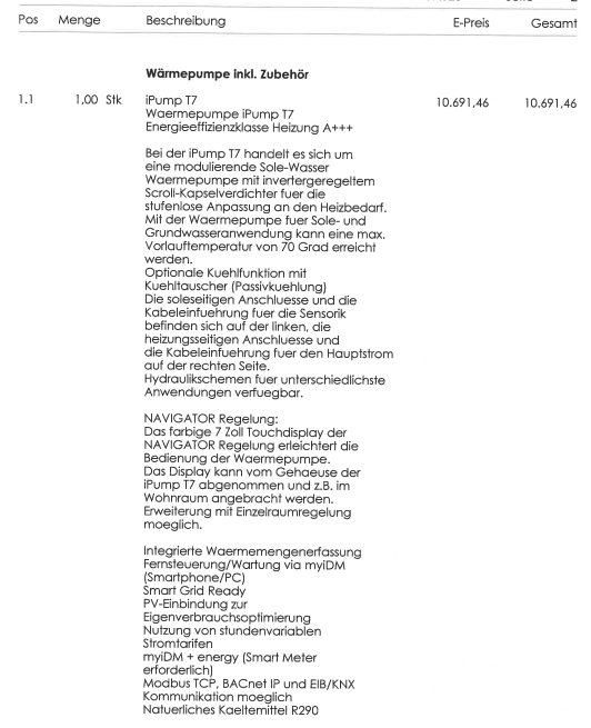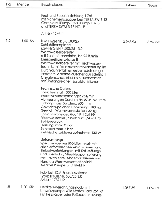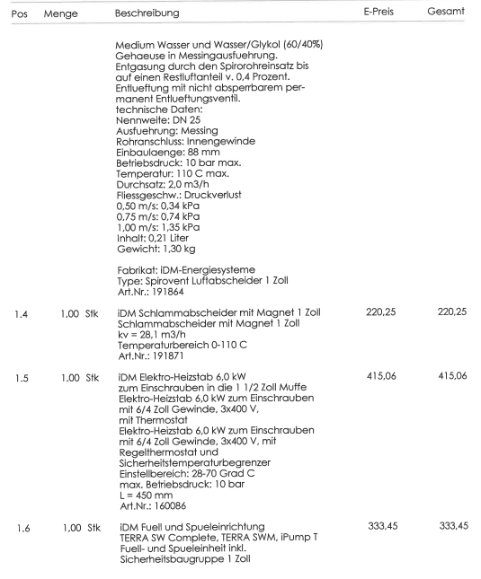 Grüß euch! Ich darf euch nun zwei neue Angebote zeigen. Einmal vom ersten Installateur, welcher hauptsächlich Vaillant verbaut, der mir damals die HK 08 mit Puffer angeboten habe, würde nun auch ohne Puffer, wie von mir gewünscht, die Heizung aufbauen. ![]() ![]() Sole hätte ich bereits, die Befüllvorrichtung könnte ich noch selbst beschaffen. |