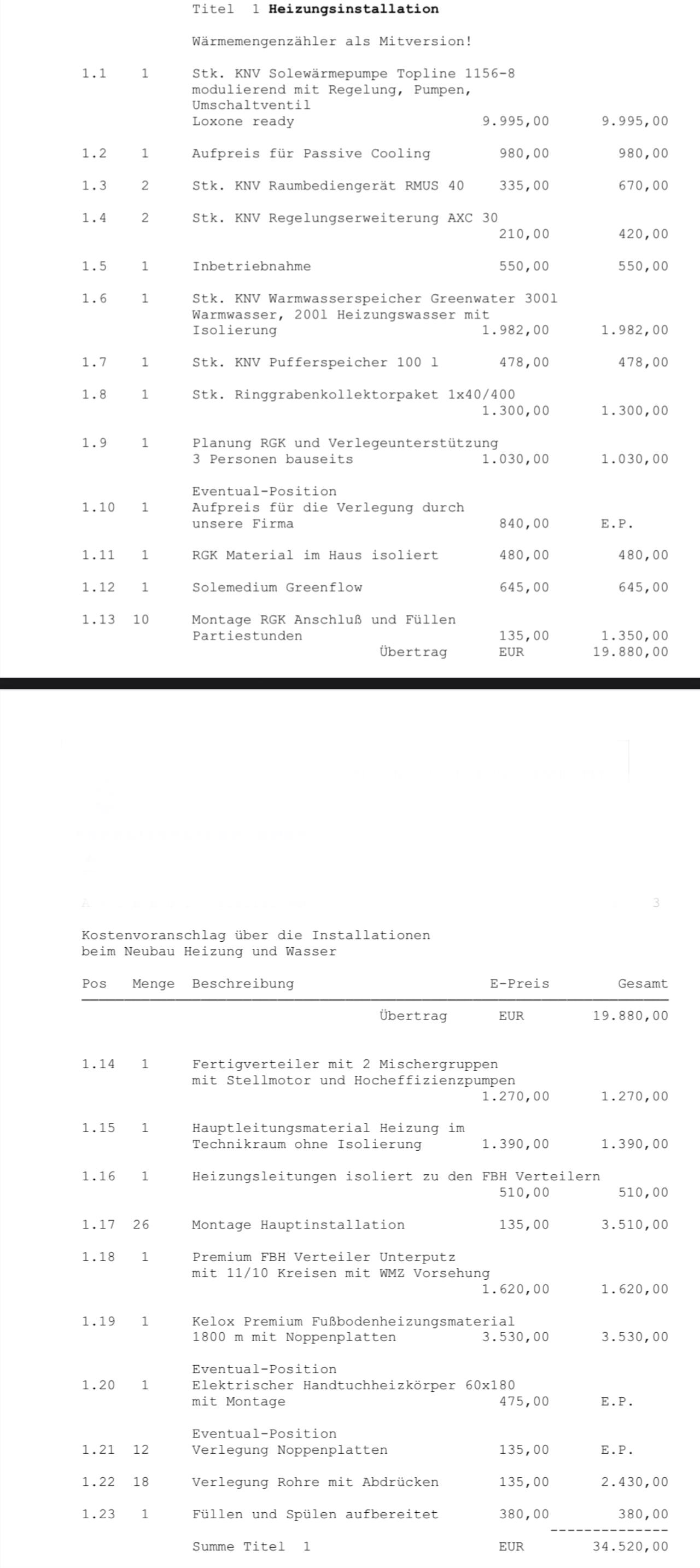 Tja, auch hier: * Raumthermostat für die Fisch', * Regelungserweiterungsset für die Fisch', * Heizungspufferspeicher absolutes No-Go und für die Fisch', * Umschaltventil 3-Wege für die Fisch', * Pumpengruppen für die Fisch'. * ADG 50l: Falls für die Sole gedacht, dann für die Fisch'. KNV soll dir die Vase mitgeben, die sie selber wegschmeissen. ---> Einfach mal 4000€ netto komplett für den Hugo. Dann: 4000€ RGK Material --> man kann zurückfragen, wie die fast 2000€ Preisaufschlag auf den RGK RGK [Ringgrabenkollektor]-Shop zustandekommen: https://www.ringgrabenkollektor.com/shop/rgk-rohrpaket-1x-300m-da40-fuer-wp-5-6-kw/ Ich komm da brutto für dein Haus inkl. Versand auf 3000€ - da ist aber die Planung dabei. Mit Selbstabholung sparst nochmal 400€. Abgesehen davon natürlich, dass auch diese WP WP [Wärmepumpe] zuviel Minimalleistung für dein Haus hat. --> EDIT: Interessant, dass du die alte S1155-6 angeboten bekommst. Naja, die wäre ja gar nicht mal sooo schlecht für dein Haus geeignet als deren Nachfolger, die S1156-6. 😂 Einsparungspotential deines Angebotes locker 6000€. Allerdings fehlen die Heizkreisverteiler für die BKA BKA [Betonkernaktivierung]. |