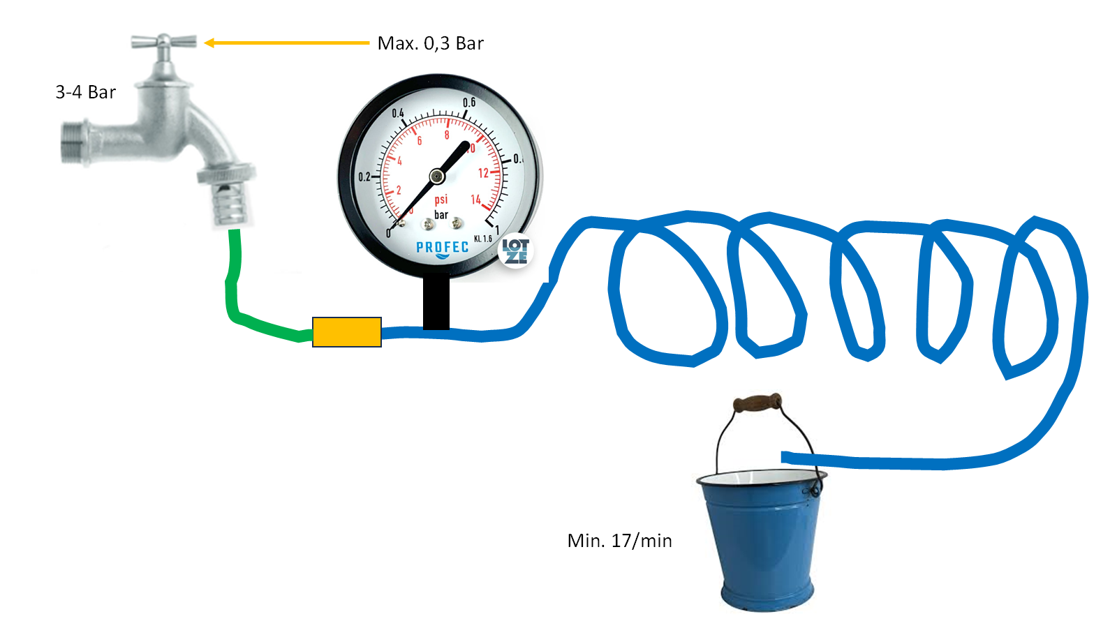 Also, mit ca. 20€ kannst den Messaufbau machen. Pi x Daumen hat der Kollektor einen Druckverlust von max. 300 mBar bei einer Durchflussrate von 1000l/h. Die WP WP [Wärmepumpe] hat einen Soledurchfluss nominal lt. Datenblatt von 680l/h. Bei 680l/h kann die Solepumpe eine freie Pressung von 0.95 Bar leisten. Zuflussmenge bei der Messung sollte schon bei 20l/min liegen.
