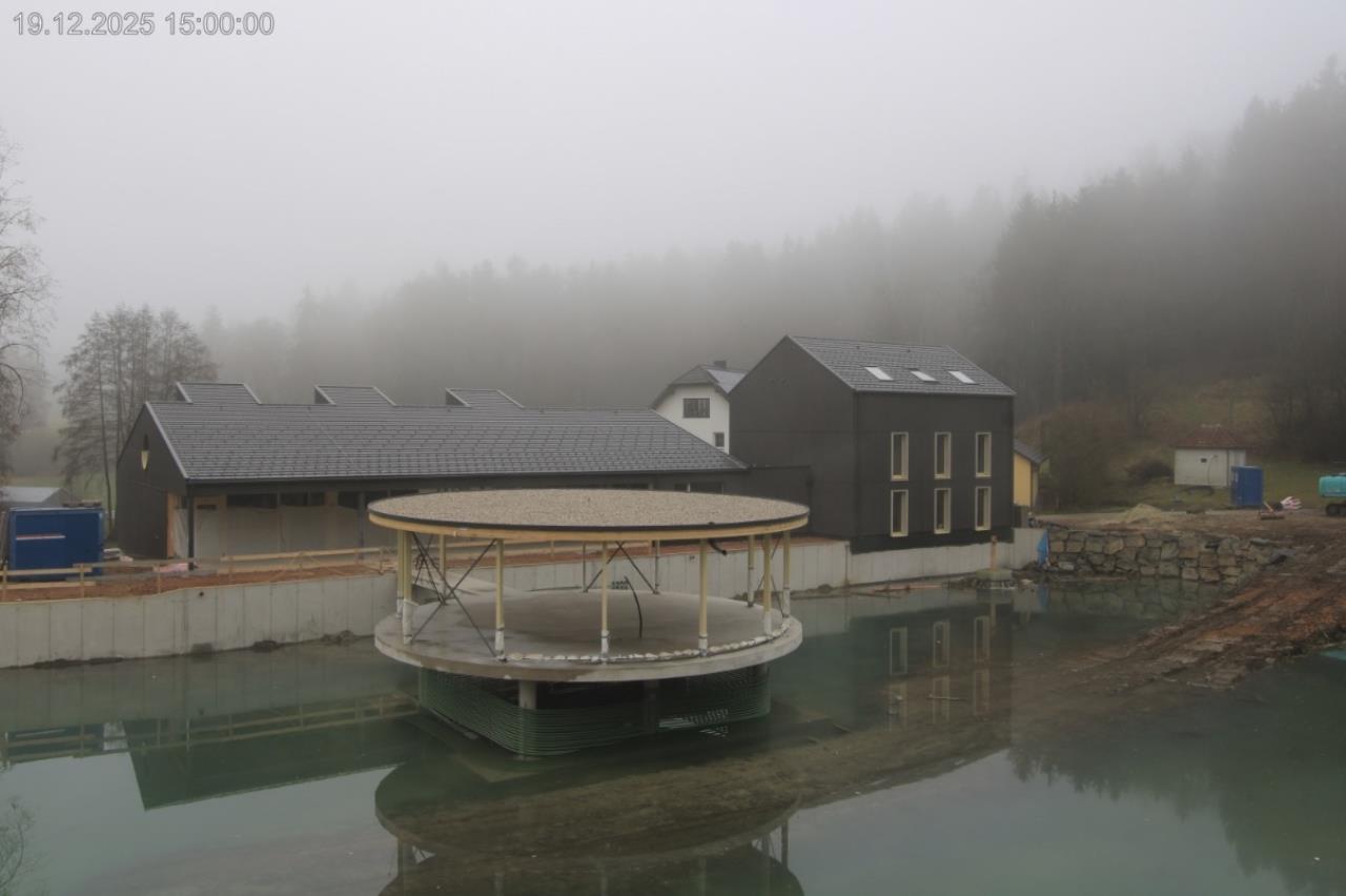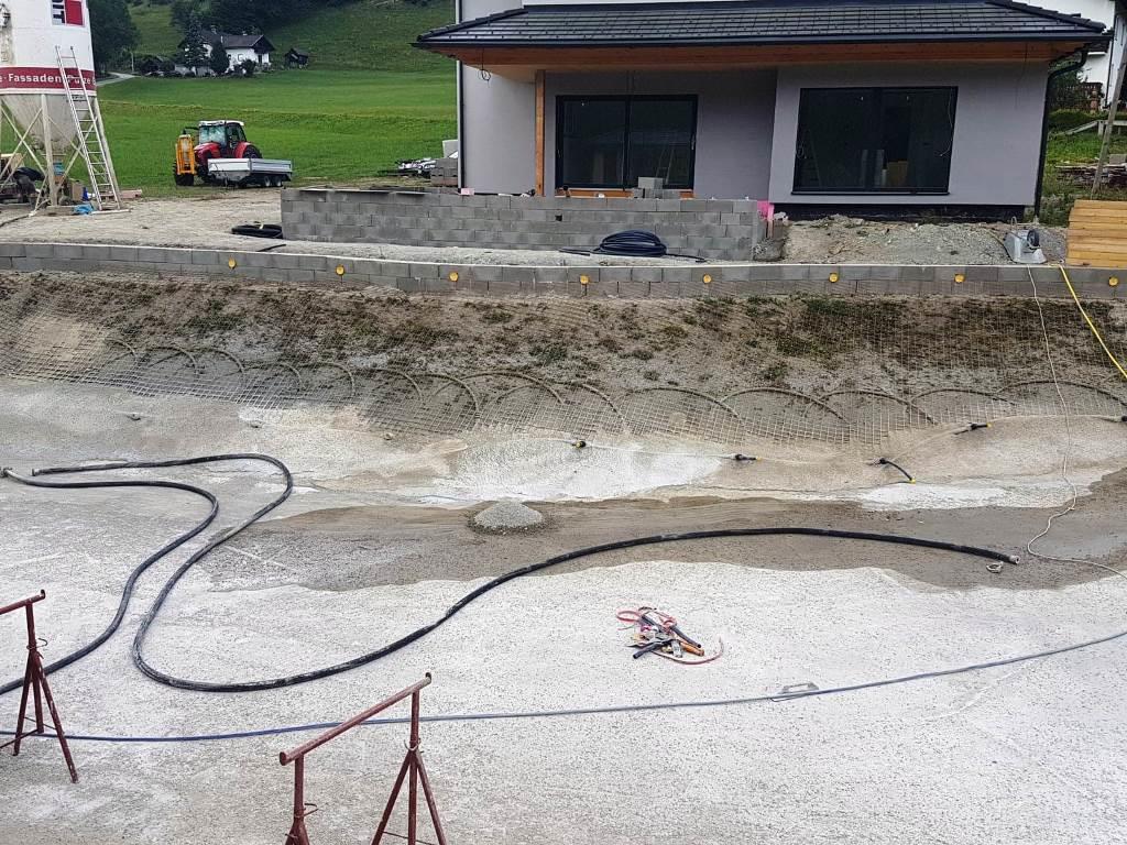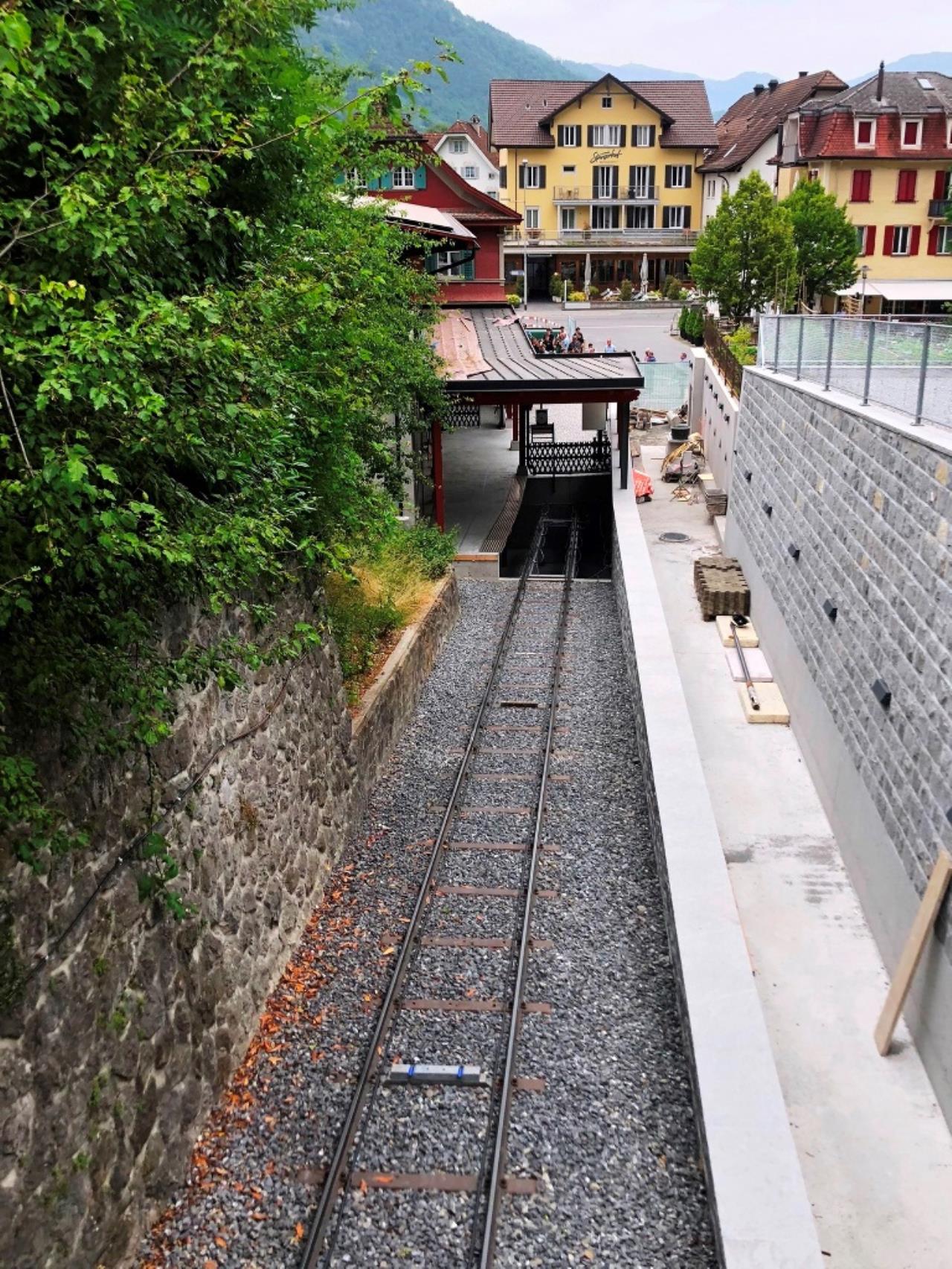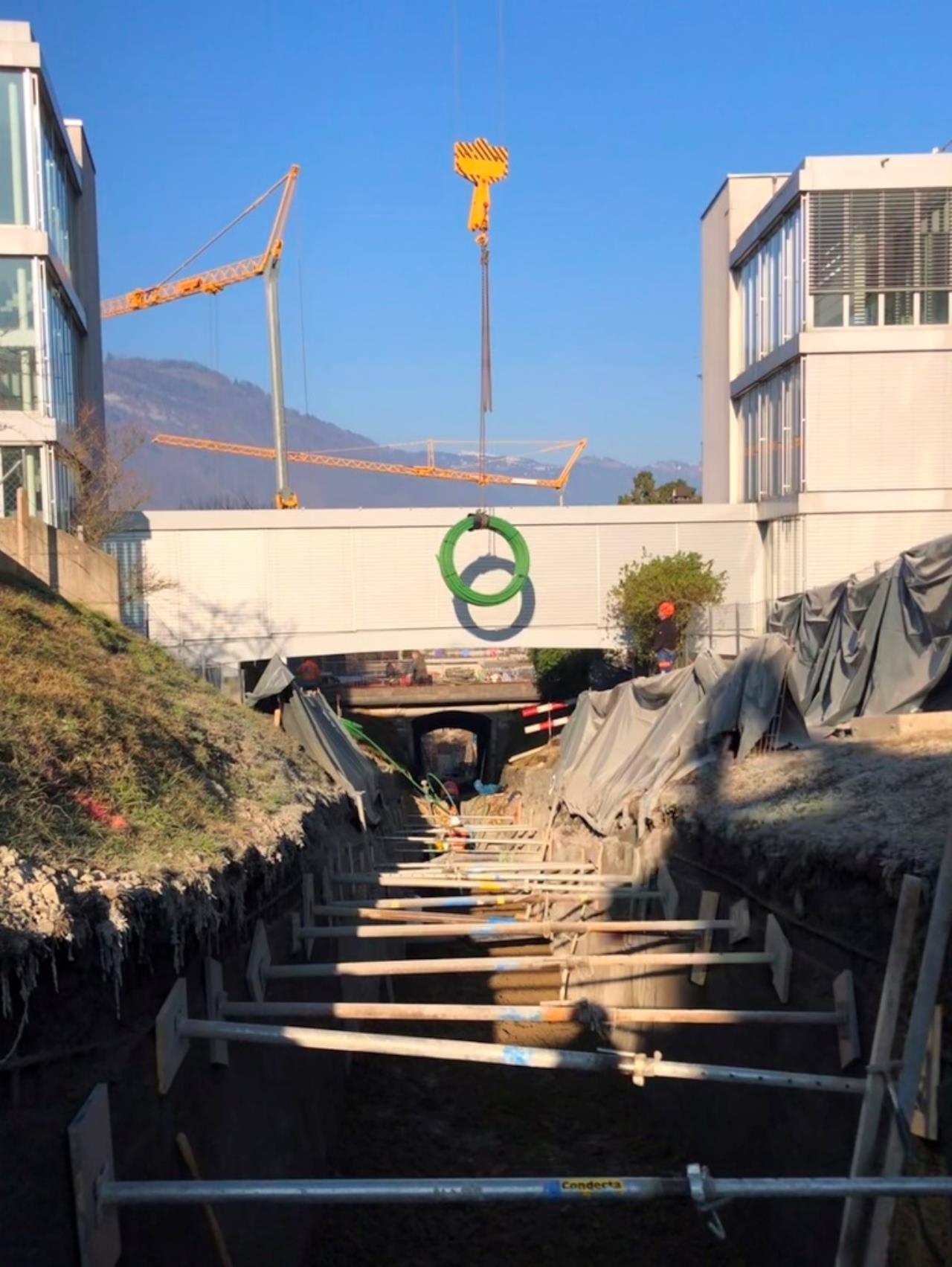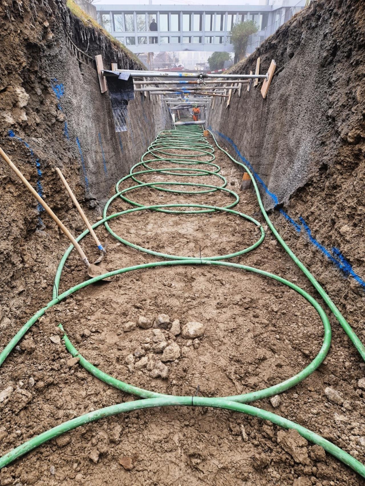 unten im tal wurde die remise neu gebaut, geplant mit dachintegrierter PV und erdwärme. wir haben lange getüftelt wie da ein RGK RGK [Ringgrabenkollektor] platz findet; dann kam die info daß die schienen im unteren bereich im zuge einer gleisrevison rausmüssen um neu gebettet zu werden. das war die chance mit dem RGK RGK [Ringgrabenkollektor] unter die geleise zu gehen. voilá erdwärme auf schiene gebracht...