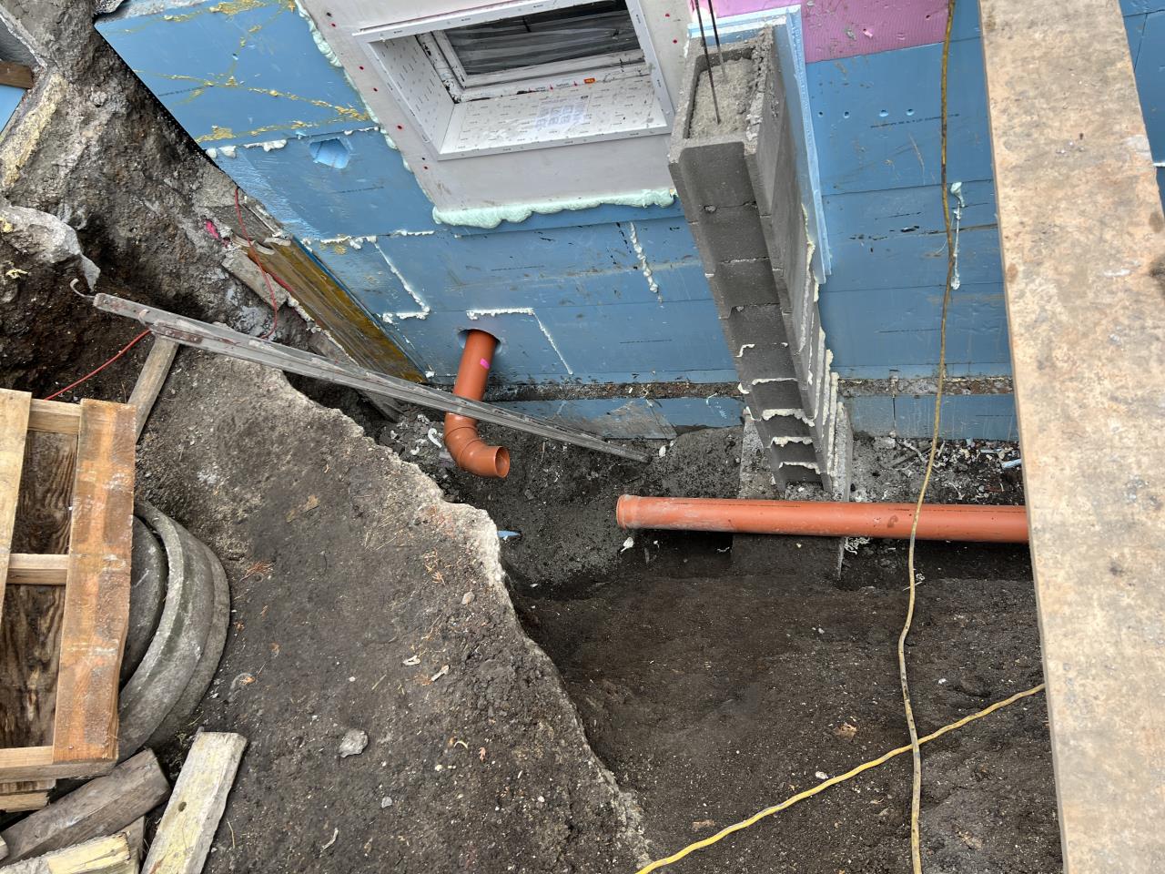 Sobald das verlegt ist wird der Rest weiter verfüllt - voraussichtlich mit weiteren 40cm Rollschotter, Trennvlies, 20cm Bruchmaterial, 20cm Mutterboden (hoher Asche/Schlackenanteil und damit gut dichtend) und der Rest mit Hummus/Erde bzw. wird gepflastert - mit leichtem Gefälle vom Haus weg.