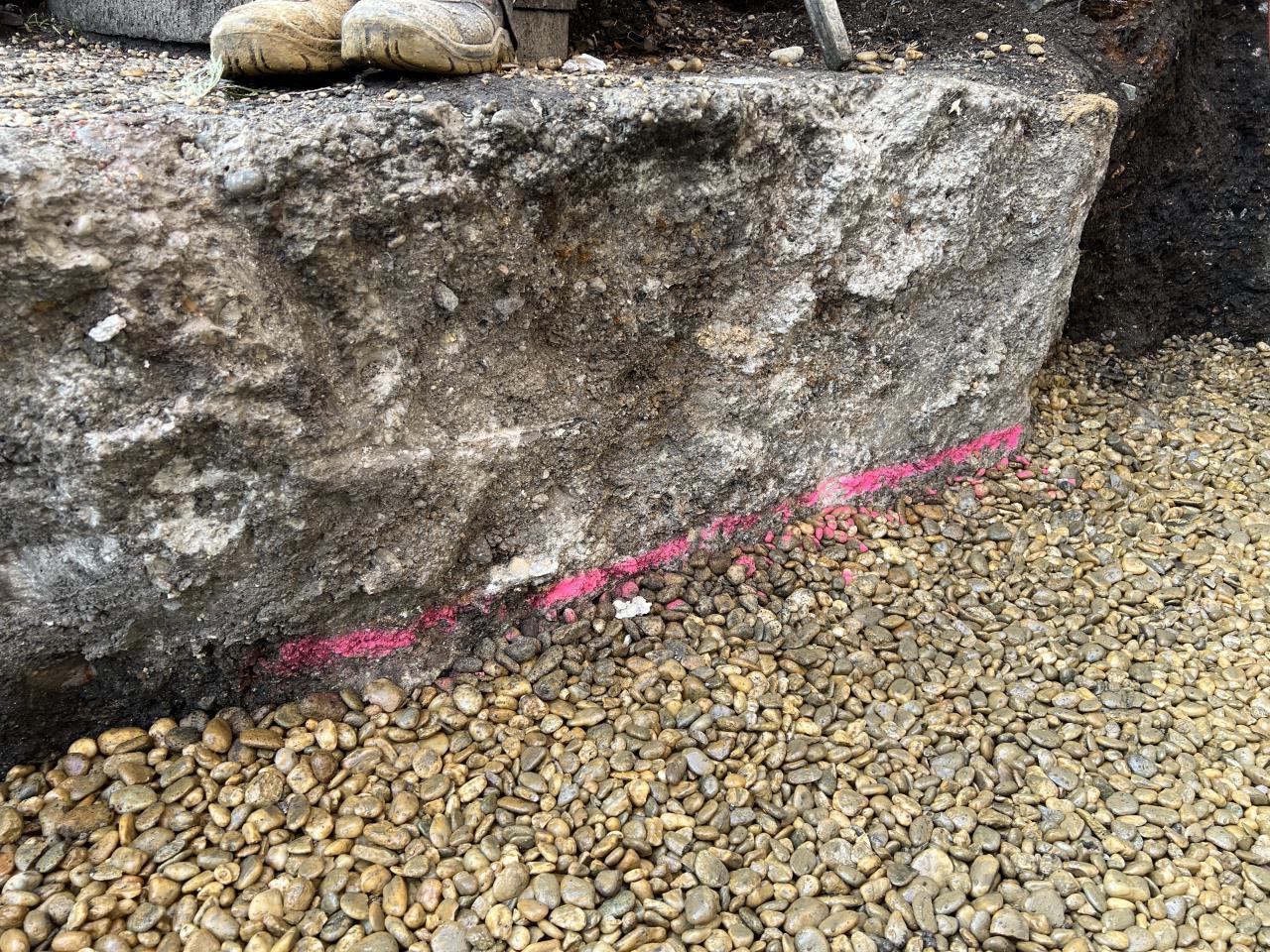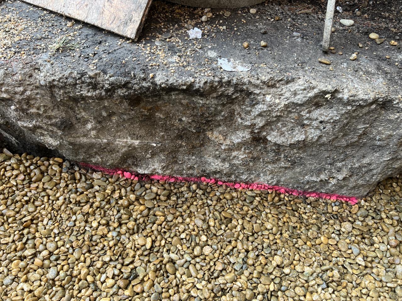 Und um der fortwährenden Diskussion betreffend Rollschotter verdichten Ja/Nein beizutragen habe ich bei der Schwergewichtsmauer (als Baugrubensicherung hin zum gekoppelten Nachbarn) eine Markierung vor dem Verdichten gemacht, und danach nochmal nachgesehen.