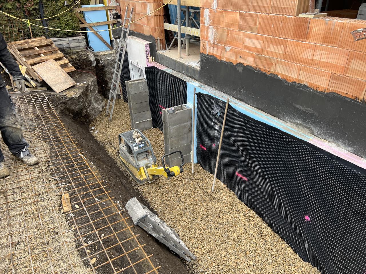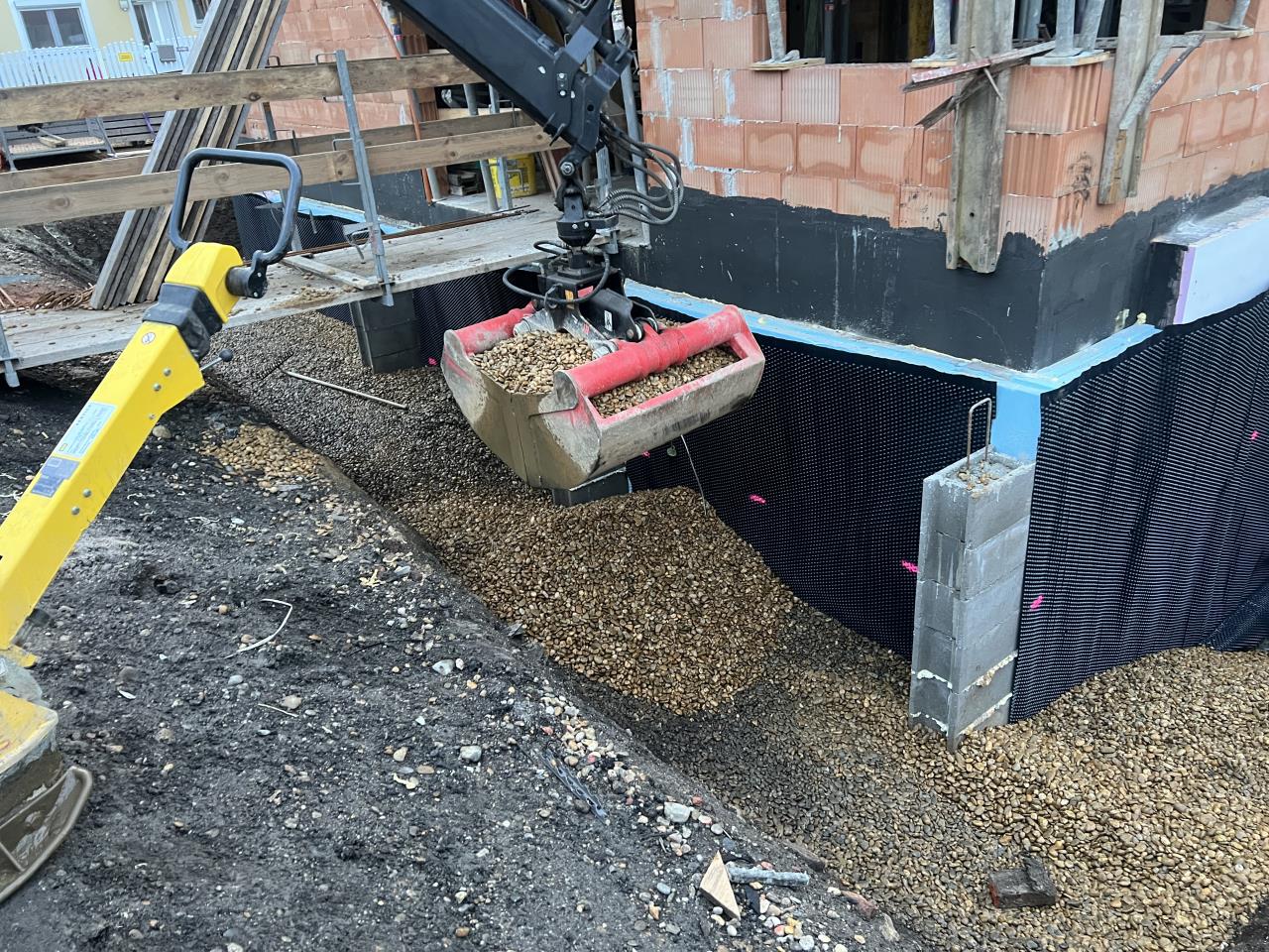 Abstand zur 16cm XPS Perimeterdämmung habe ich versucht von etwa 10-20 cm zu halten, da ich sonst die Kellerabdichtung (Superflex D24 - hier beschrieben: https://www.energiesparhaus.at/forum-erfahrungsbericht-kellerabdichtung-kellerneubau-superflex-d24/84440) beschädigen könnte.