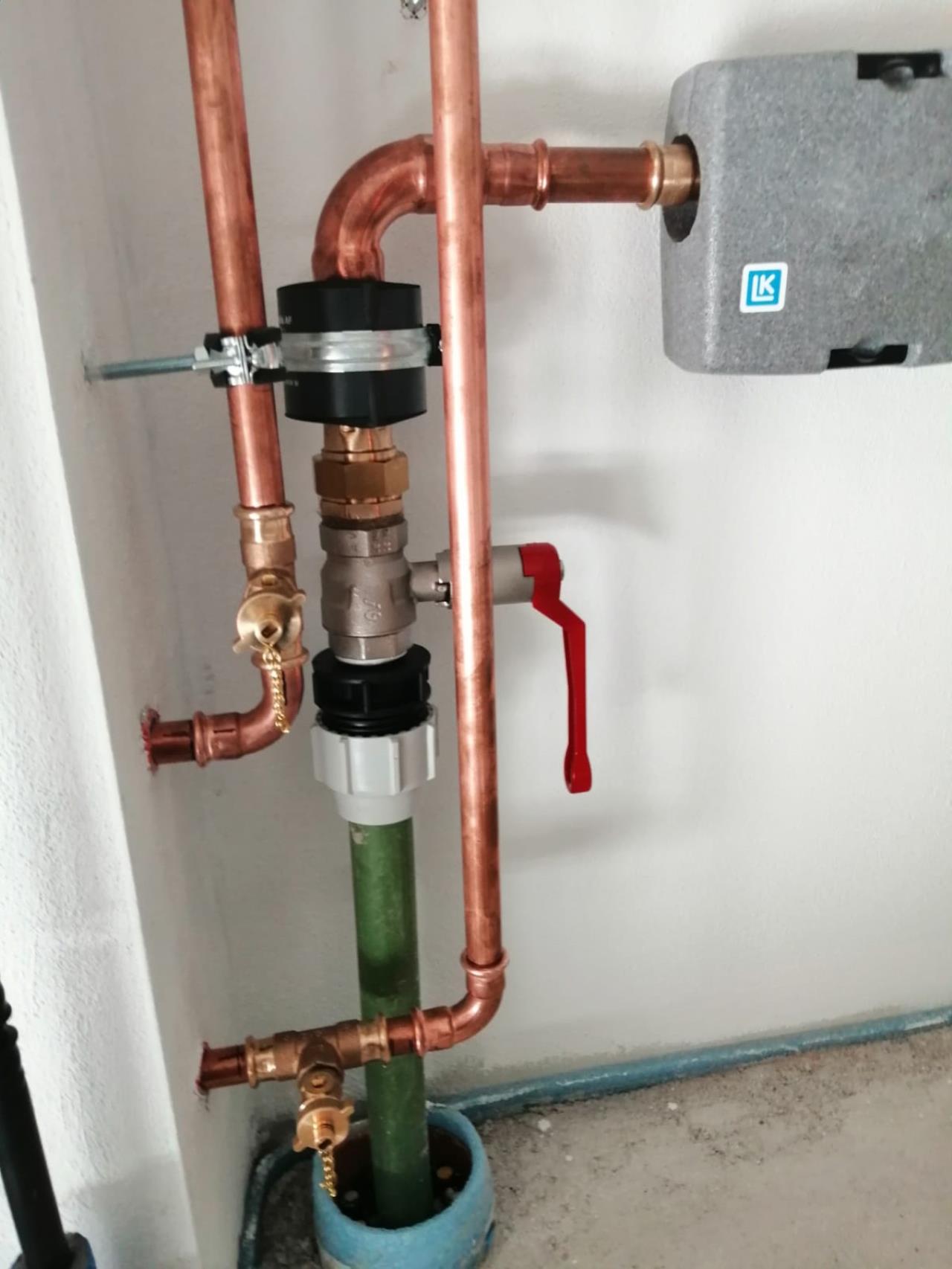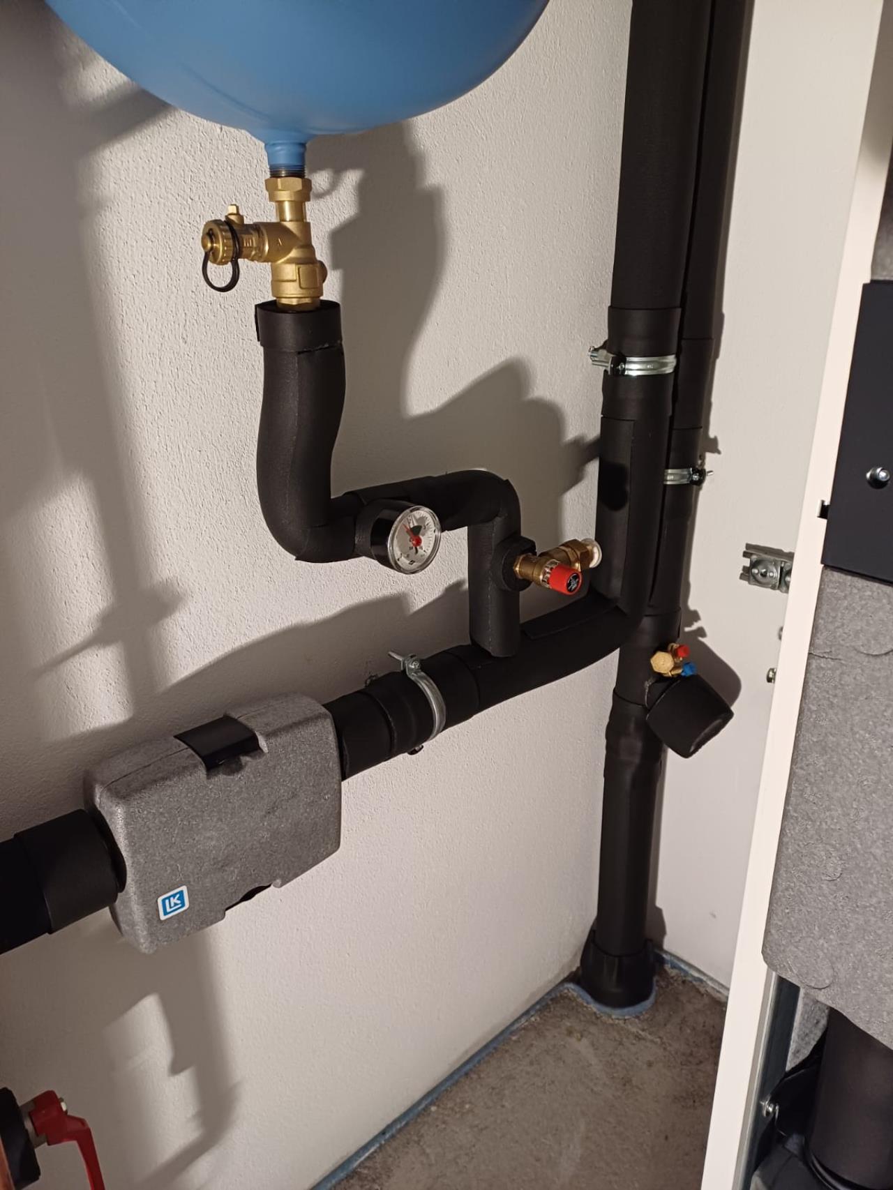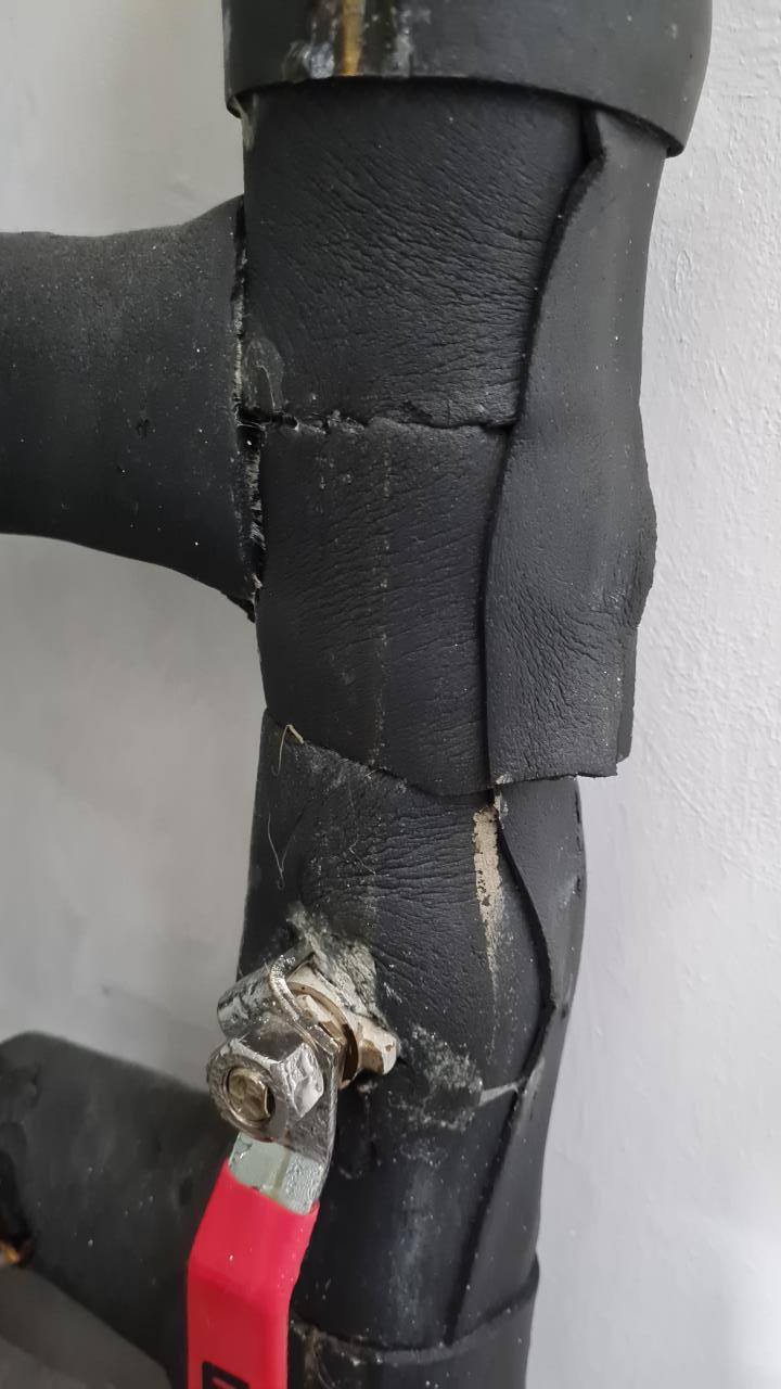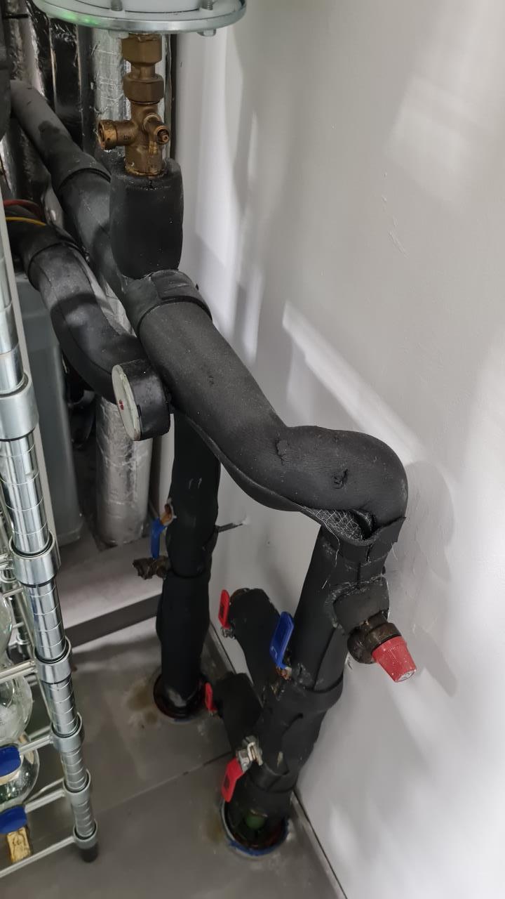 Sehr schlamig isoliert, wahrscheinlich auch die Stöße in Rohrrichtung ungenügend oder schlecht verklebt. Bei den Kugelhähnen und Absperrungen sollte entweder drüberisoliert werden (Griff demontieren) oder mit Spindelverlängerungen. Stichleitungen zum MAG eventuell zu kurz wegen längerer Isolationsstrecke.. |
