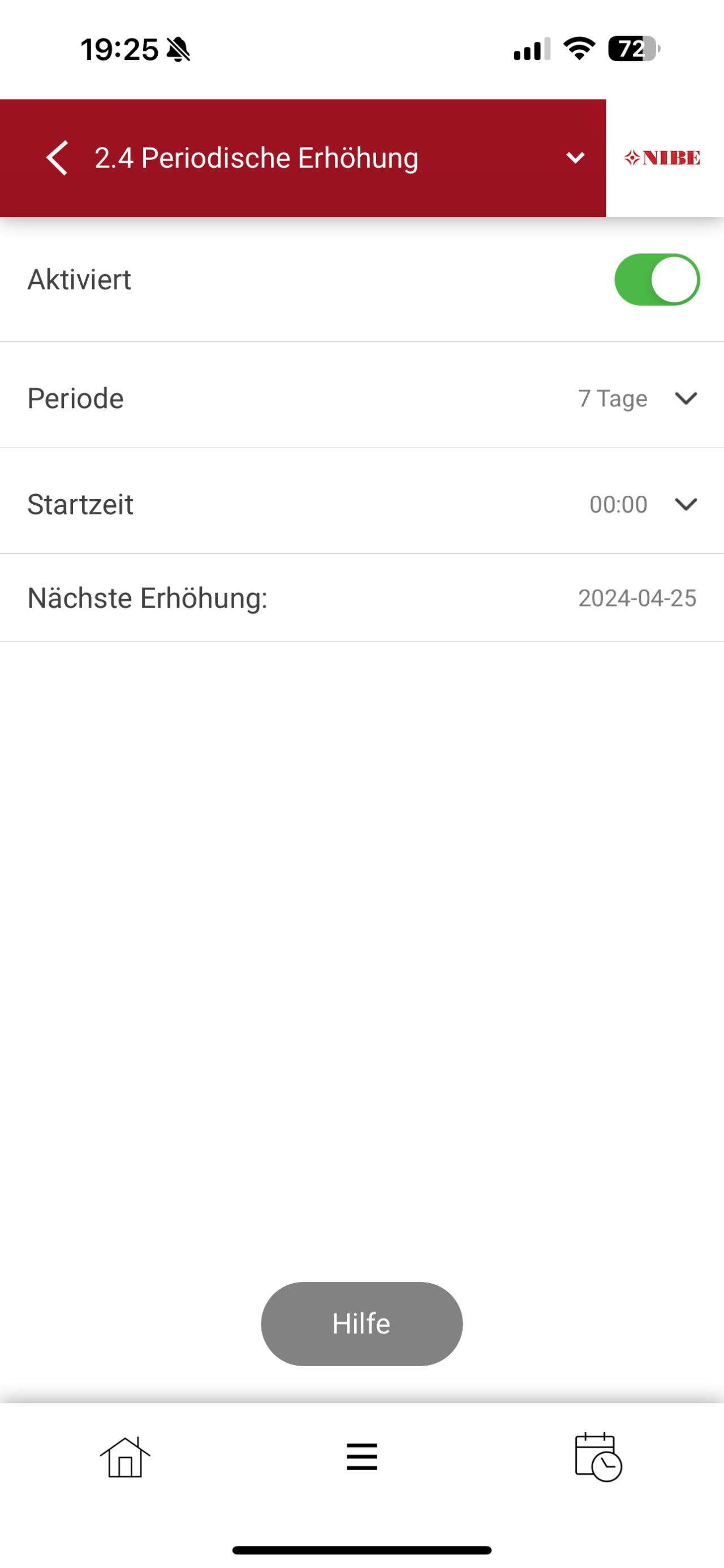 Hi, ich habe den Thread bzgl. Nibe .... Bedeutung der Parameter in diesem Forum eröffnet. Und es kamen viele gute Hinweise und Erklärungen!! Jetzt habe ich diesen Thread gesehen und muss sage, es gibt im Forum wirklich ein paar Spezialisten mit sehr guten Kenntnissen. Und super nett, dass all diese Spezialisten ihre Zeit investieren und uns Anfängern helfen. Danke!! Ach unsere Installationsfirma war nicht sehr hilfreich bei einer guten Einstellung. Glaube, z.T. wissen die Monteure es auch gar nicht besser. Aber, dass ist schon echt traurig!! Frage zu Hinweis bzgl. Menüpkt. 7.1.10.1 ("Torte"): Den guten Hinweis bekam ich auch. Aber warum ist denn gerade 180 (min) der Maxwert?? Bedeutet das, dass spätestens nach 3 h dann der Modus gewechselt wird? Einen Bezug zu 24 h hätte ich ja noch verstanden, oder eine prozentuale Verteilung. Danke fürs "Schlauermachen" ! Beste Grüße |