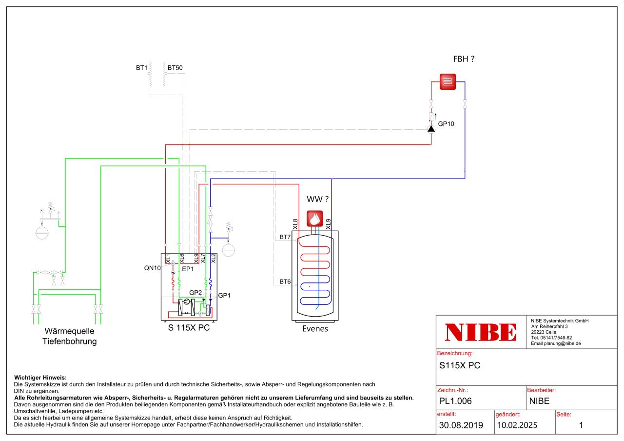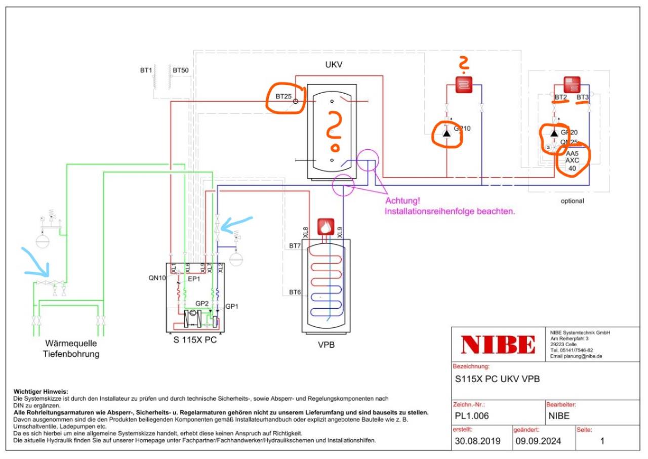 "noch nicht weitergemacht" Nein, außer wie geschrieben Durchfluss auf 70% gestellt, habe extra auf das Thermometer gewartet, kommt evtl. morgen. Es ist kein Raumeinfluss aktiviert und keine Raumbedieneinheit installiert. Dennoch ist der BT50 übrig. Daher auch die Idee. Dachte halt, dass die sogar genauer sind, als das bestellte Thermometer und 2 der 3 FBH FBH [Fußbodenheizung]-Verteiler sind nahe der Nibe. Magnetitabscheider leeren und spülen hört sich laut Anleitung einfach an. Aber ist außer dem Abdrehen der Hähne vor und nach dem Abscheider auch die HU-Pumpe kurz auszustellen? Fotos von der Anlage hatte ich dachte ich eingestellt. War aber doch im anderen Thema Z.leitung: https://www.energiesparhaus.at/forum-zirkulationsleitung-spuelen/81789_1#863040 Sonstige Siebe/Filter: Keine Ahnung ob und wenn ja wo die sind und wie zu öffnen und reinigen. Hydraulikplan: Habe nur ein allgemeines Nibe-Schema. Das hing aber auch im Heizraum bei der Installation der Anlage. Ob das genau zu meiner Anlage passt? Der Speicher ist ein Evenes, kein Nibe. |