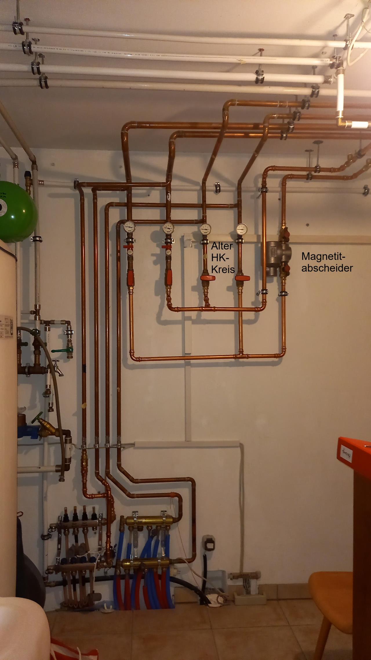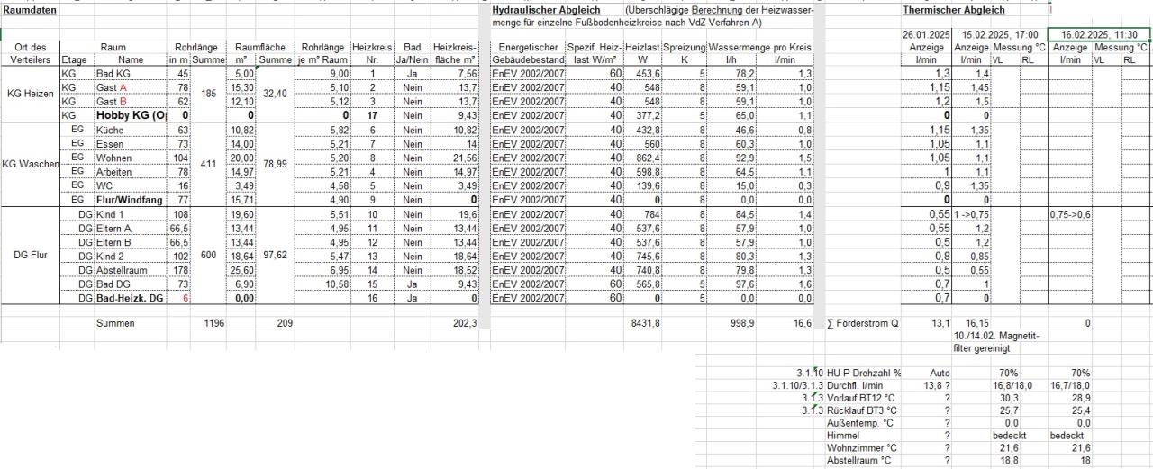 Die Leitungen zu den alten Heizkörpern sind nach wie vor zu. Das dort fehlende VE-Wasser habe ich auch bemängelt und verlangt, dass das dort auch ergänzt/getauscht wird. Die Heizkörperthermostate waren nämlich alle zu während der Arbeiten. Er hat dabei was von Parallelentsalzung geredet. Bin gespannt. Vielleicht kommt dann auch noch Dreck raus. Wenn er das macht, kann ich ja mal fragen, wie er das mit dem VE-Wasser ausgeführt hat und warum die Gläsern nun schon bräunlich werden. Die Leitungen zu den Heizkörpern sind Kunststoff. Mit Schwarzstahl meinst Du die Heizkörper? Das sind ganz normale Heizkörper von 2004. Und praktisch nie in Betrieb gewesen. Rer Raum mit dem langen Kreis ist nur mit dem höheren Gesamtdurchfluss wärmer geworden. Oder es liegt auch am Wetter? Letzthin war es auch kälter. Der Raum hat statt 16,x nun 19°C bei tags 4°C und nachts wenige Minusgrade. Wenn ich nun noch alle anderen drossele und die Drehzahl bei 70% belasse, wird der Raum wärmer, aber die anderen auch kälter, oder? Wenn ja, müsste ich mit der Drehzahl statt der Heizkurve hoch? |