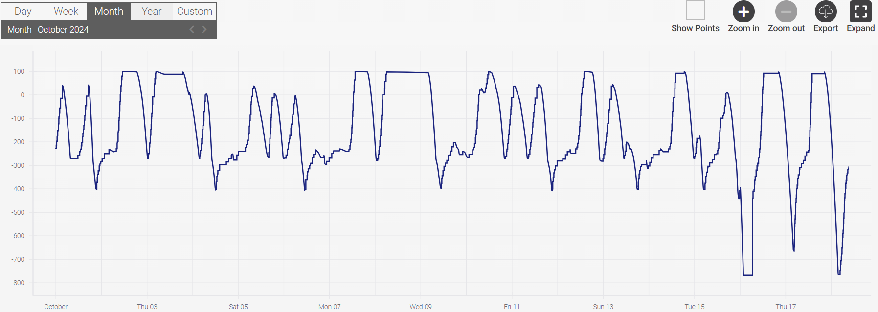 Ok, verstehe. Hab jetzt mal nachgesehen, und tatsächlich die Gradminuten fallen über Nacht auf -780 bei mir. Das wiederum verstehe ich nicht. Die Steuerung ist mir noch nicht klar, da der Innentemperaturfühler in der früh immer noch 22,8 Grad angezeigt hat bei eingestellten 22. Warum fallen die Gradminuten dann so tief? hier mal ein Auszug von der letzten Woche. Man sieht genau, dass ich vor 2 Tagen die Blockade von 20 - 04Uhr eingestellt habe, da fallen die Gradminuten in der Nacht massiv runter, darum sprintet die WP WP [Wärmepumpe] um 4Uhr los. warum diese so stark fallen, bei gleichbleibender Innenraumtemp, ist mir nicht klar. |
