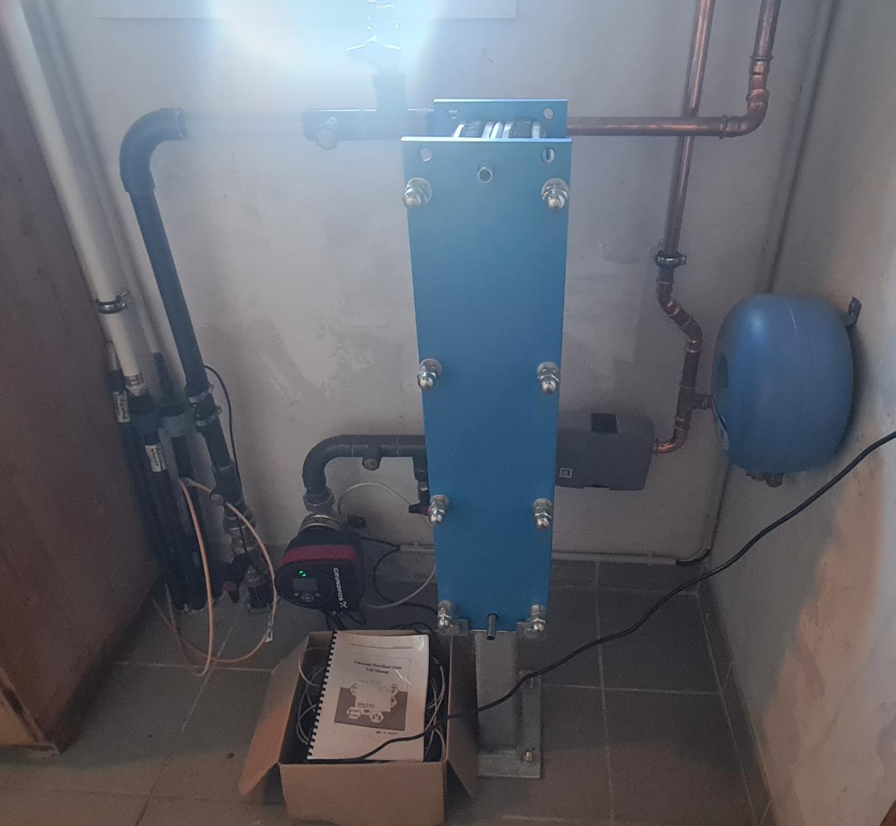 Mein saugheber ist auch seit 2 Monaten in betrieb. Da sich bei mir alles so lange hingezogen hat, hab ich eventuell ein wenig mehr zeit in planung und komponentenauswahl gesteckt, als nötig wäre 😀 Wenn ich mal zeit finde, möchte ich das auch alles niederschrieben. Der höchste punkt vom saugheber ist ca 4,5m über grundwasser, die pumpe sitzt 1m tiefer. Ich habe eine magna3 32-80 (billiger gebrauchtkauf), die ist so kräftig, dass ich damit entlüften kann, wenn die Steigleitung gefüllt ist! Habe auch spülanschlüsse usw vorgesehen, die ich jetzt gar nicht brauche. Ich bekomme im stillstand innerhalb von minuten die hängende wassersäule in der schluckleitung. Daher auch bei mir mit mindestens 30W dauerbetrieb, das entspricht bei mir 2,3m³/h (gemessen!). Die anzeige der magna3 stimmt bei mir überhaupt nicht, vermutlich weil die den durchfluss über differenzdruckmessung schätzt und wir hier im unterdruck unterwegs sind. Im winter stört der dauerbetrieb ja nicht, da läuft die WP WP [Wärmepumpe] eh ganze zeit. Für den sommer werd ich dann was basteln: Die magna3 lässt sich über 3 digitaleingänge einschalten, aber auch in die minimale oder maximale kennlinie versetzen. Wie bereits erwähnt, kann ich bei meiner anlage mit 2 minuten vollgas entlüften, auch wenn die schluckleitung komplett leer ist. Ich plane daher ein relais zu verbauen, mit dem ich die pumpe einschalte, aber eben beim einschalten für bestimmte Zeit die maximale kennlinie aktiviere. So wäre das problem auch für die WW WW [Warmwasser] bereitung im sommer elegant gelöst. Dazu aber ein anderes mal, und wenn ichs eventuell schon getestet habe. Ein passende relais habe ich schon gefunden. Wer externe Steuerung programmieren kann, ist dalit wahrscheinlich besser bedient. Ich kann sie aber weder programmieren, noch habe ich Anwendungen dafür. Nur zum einschalten bzw durchspülen ist das overkill. Hier noch ein bescheidenes foto: (Ja, ja, wird eh noch isoliert. Schwitzt aber in dem unbeheizten Raum und 12-13 °C sole-ein und 9-10°C sole-aus eh nicht) |