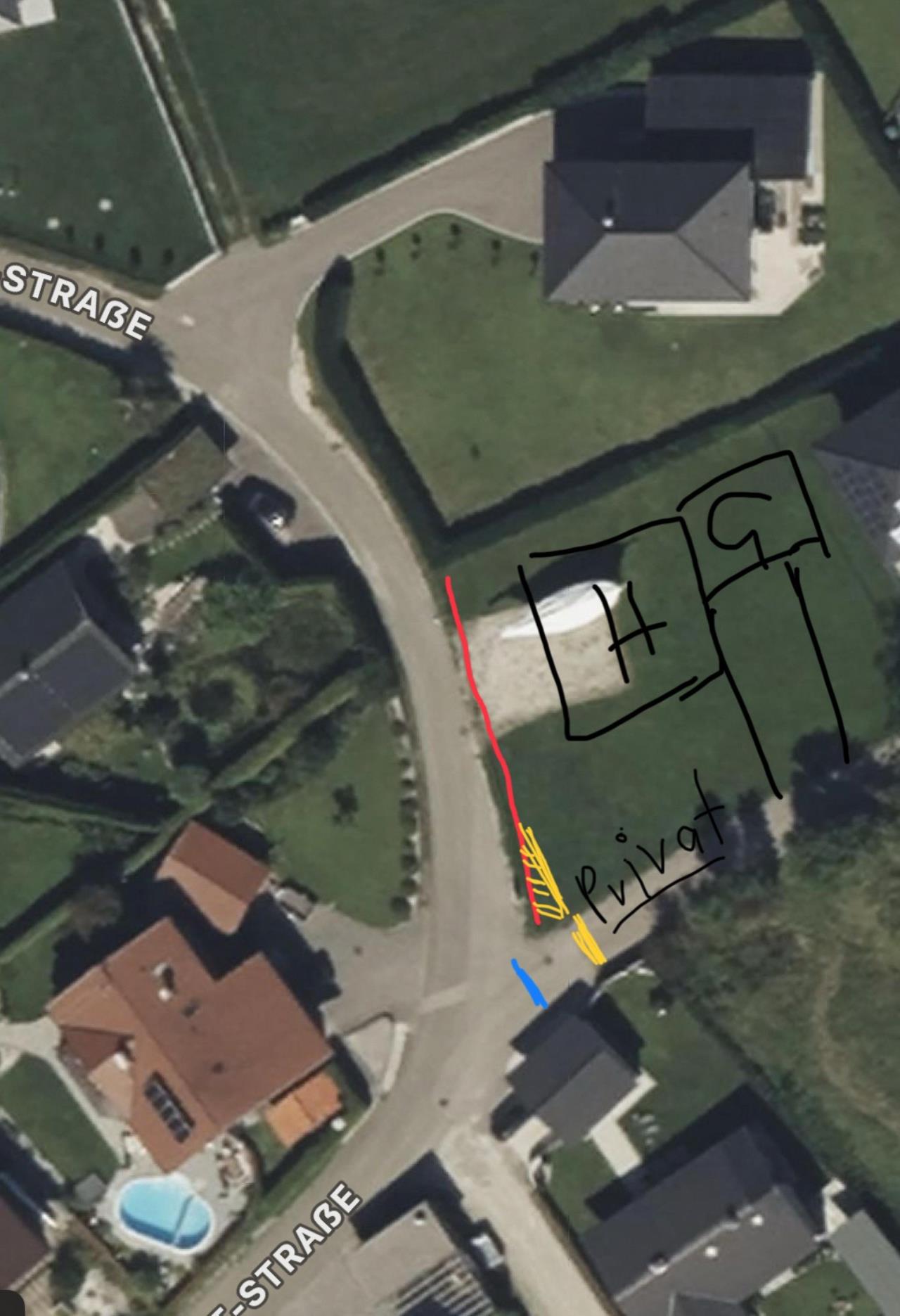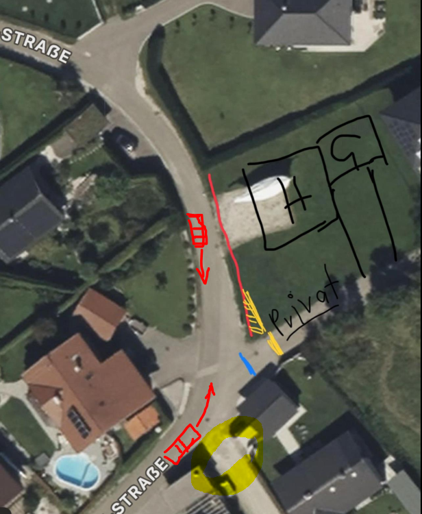 Die Fälle sind nicht vergleichbar. Bei uns liegt eine Kurve vor, sodass der (potentiell gefährlichere) Verkehr von links (kommt eigentlich von vorne) sofort einsehbar ist. Die Autos von rechts orientieren sich natürlich an der rechten Straßenseite. Zudem gibt es, wie schon geschrieben, einen recht großen "Freibereich" außerhalb des Strassenverlaufs. btw: wie siehst du dann die gelb eingeringete Ausfahrt (Bild unten)? Das Carport verdeckt die Sicht auf den von links kommenden Verkehr. Die Situation ist für mich potentiell viel gefährlicher |