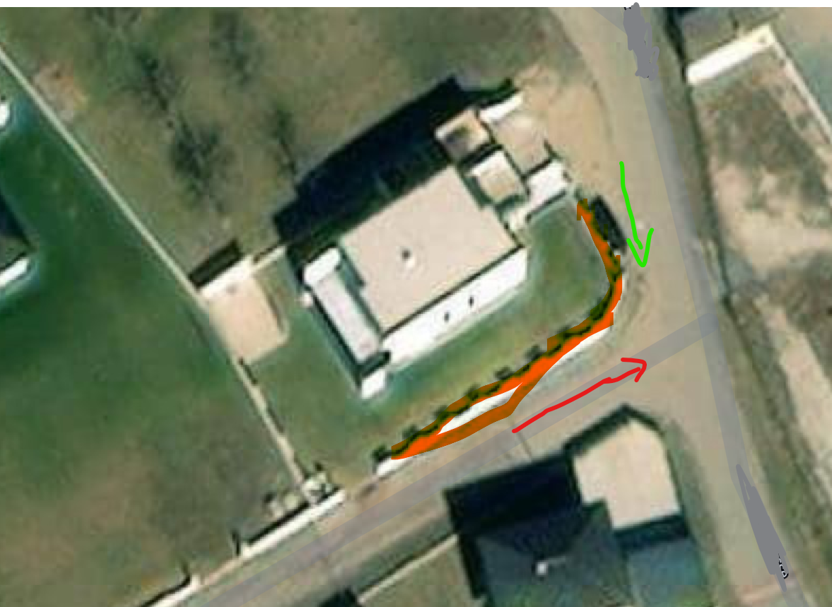 Ein Beispiel, das eurem recht ähnlich ist: Die Einfriedung (orange markiert) ist ~1,5m hoch. Wenn ich aus der Richtung mit dem roten Pfeil komme, sehe ich jene, die aus der Richtung mit dem grünen Pfeil kommen, erst sehr spät. Und das obwohl die Ecke nach innen versetzt ist. Hier hätte es schon ein paar mal fast gekracht, obwohl hier überall Tempo 30 gilt. |