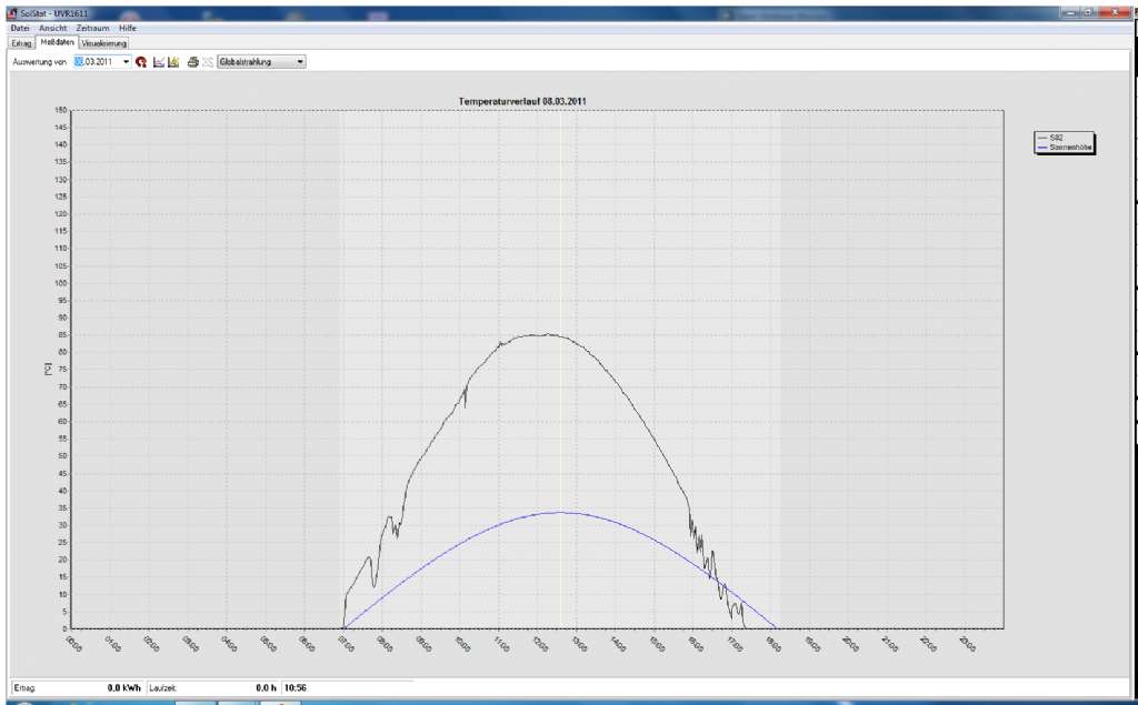 Dandjo, - wenn Deine Berechnungen stimmen, dann stelle ich hier einmal die Strahlungswerte für 07.03-08.03 ein. Standort-Koordinaten 48,2N, 16,2E. Die schwarze Linie steht für die Globalstrahlung, die Blaue für den Sonnenstand. Lass Dich nicht durch die Überschrift "Temperaturverlauf" und "Ertrag" und "Laufzeit" verwirren. Die Daten stammen vom Erweiterungsmodul (CAN I/O 44) des Solarreglers (UVR 1611), der bei mir keine ertragsrelevanten Daten liefert.