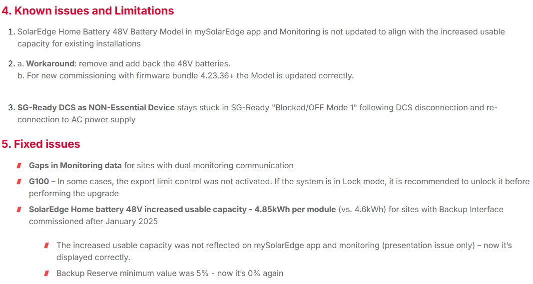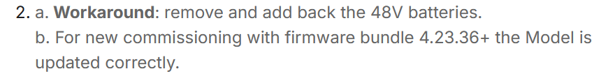 Hab mich leider auch zu früh gefreut mit der 4.23.36 Fimware. Habs jetzt nach meinem Urlaub nochmal gecheckt und hatte genau das Problem das bei den known issues steht: Hab dann gestern Abend den vorgeschlagenen workaround gemacht: Also bei Anlagenkommunikation/CAN einmal Batterie auf None und dann wieder zurück auf 2 Module. Das Modell zeigt er jetzt auch korrekt, nur die Usable Energy ist wieder zurück auf 9,2kWh.... Muss ich jetzt ein Ticket aufmachen oder gibts eine andere Lösung dafür? |