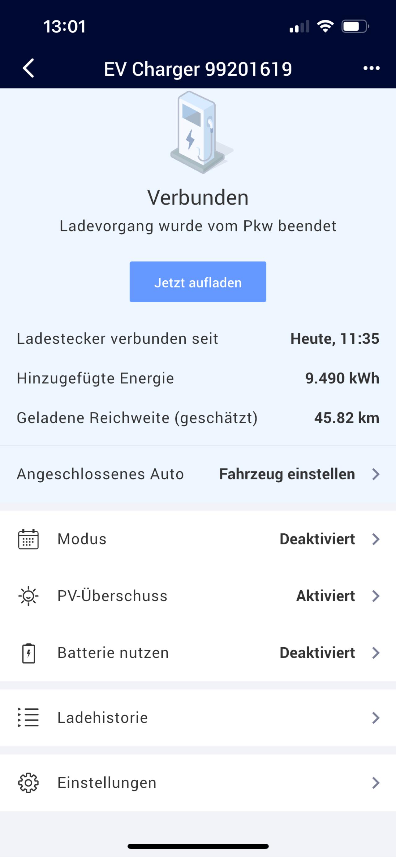 - Batterie wird maximal gezogen bis auf Leer, was Aufo halt braucht. Einstellen (Entladeleistung/Menge) kannst aktuell noch nicht, der Punkt ist eher fuers "JETZ LADEN- Vollgas-Manuell" gedacht so unsere Info