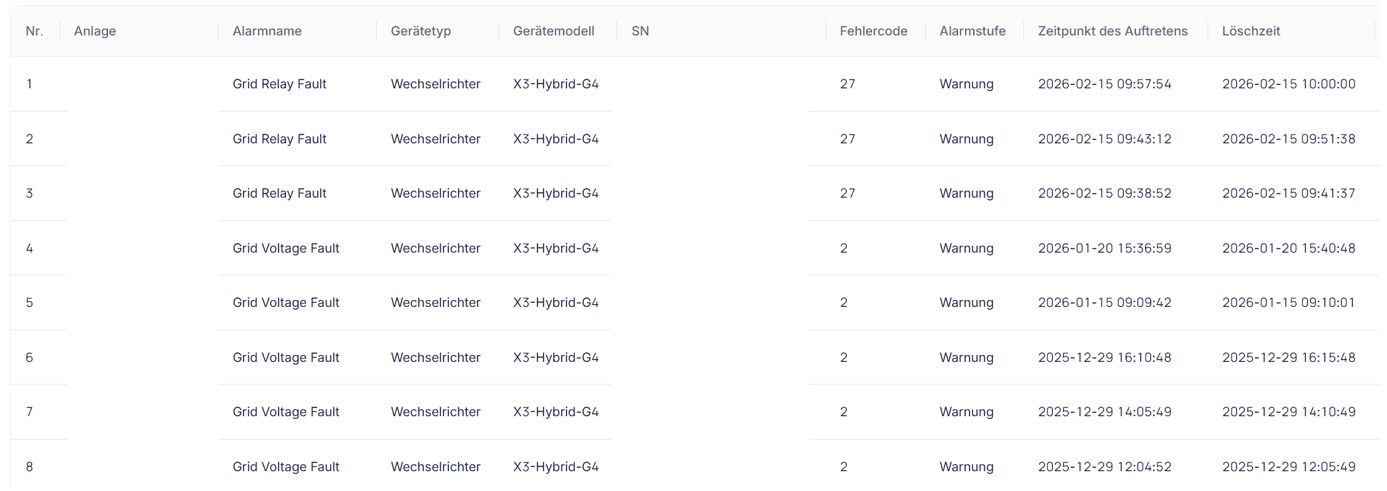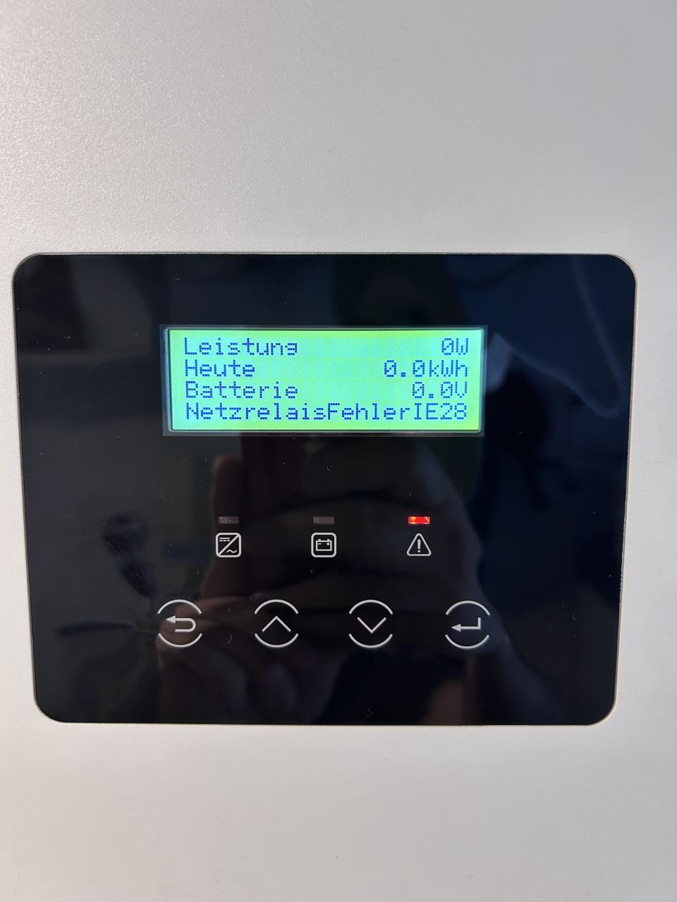 Was sagen die Fehler Protokolle? Hast du noch andere Anzeigen im Menü (Spannung, Hz) Speicher verbaut? welcher? Eventuell: Im Menü unter "Fehlerprotokolle" (letzte 6 Fehler lesen) oder "Work mode → Manual → Force charge" Batterie erzwingen laden |