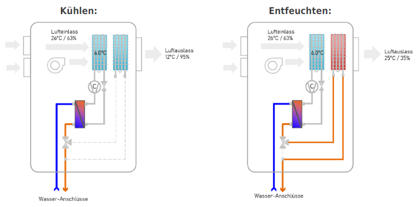 du hast das ganze ja schon sehr gut beobachtet und verstanden. Hier vielleicht noch die paar letzten Details fürs "full picture" 😉 DWF: die 150m³/h sind kein schwarz/weiß Limit. Wenn mit etwas mehr Wasserdurchsatz bzw. mit kühlerem Wasser gefahren wird, geht sicher auch weniger. Der Hintergrund vom min. Luftdurchsatz ist folgender: Beim DWF sitzt der Kondensator in Form eines Luft/Kältemittel-Wärmetauschers direkt nach dem Verdampfer-Register im Luftstrom: Damit das Kältmittel nicht überhitzt, und das Gerät nicht mit Hochdruckalarm abstellt, braucht es also einen gewissen min.Luftdurchsatz um dieses Kondenstor-Register nicht überhitzen zu lassen. Wird die Luft mit kühlerem Wasser oder mehr Durchsatz im Vorkühlregister schon gut "vorkonditioniert" dann sind auch deutlich unter 150m³/h möglich. Bei Sole-Systemen haben wir da auch Geräte mit ~80m³/h ohne Probleme laufen. Irgendwann ist dann aber trotzdem Schluss, und dann stellt das Gerät ab. Und muss stromlos gemacht werden, um dann wieder Fehlerfrei starten zu können. "Empfohlen" wird der Graubereich unter 150m³/h daher eher nicht so... Allzu gesund für die Hardware ist es auch nicht. "runter-Regulieren" geht nicht. Das DWF hat einen einfachen On/Off Kompressor installiert. Wichtig ist es also, folgendes Einzuhalten - min. Luftdurchsatz - min. Wasserdurchsatz - max. Wassertemperatur Für die genauen physikalischen Grenzwerte des Einsatzes stehen diese Parameter in gegenseitiger Wechselwirkung. HRDS+: Bei diesem Gerät ist das etwas anders gelöst. Hier ist der Kondenstor als Wasser/Kältemittel-Plattenwärmetauscher ausgeführt und sitzt abseits vom Luftstrom. Die Kondensator-Kühlung passiert zunächst also rein nur über den Wasserkreis. Im Entfeuchtungsmodus wird auch das Luft/Wasser Nachheizregister durchströmt, was die abzuführende Wärmeleistung über den Wasserkreis reduziert. (weil dann ein großer Teil der Leistung für die Luftnacherwärmung verwendet wird) Aber daher gibt es hier in erster Betrachtung auch keinen min. notwendigen Luftdurchsatz. Weil der Kondenstor ja eh vollständig über den Wasserkreis gekühlt wird. Einen min. Luftstrom gibt es aber trotzdem: Weil sonst das Verdampfer-Register einfrieren würde. Hier ist also eher der Verdampfer-Frostschutz das untere Limit, als die Kondensator-Überhitzung. Und das HRDS+ hat auch einen Inverter-Kompressor. Es kann also auch mit weniger Kompressor-Leistung fahren - sprich, nochmal deutlich weniger min. Luftdurchsatz. Aber beim Ganzen streben nach min. Durchsatz: Bitte nicht vergessen: damit verlieren die Geräte natürlich auch an übertragbarer Leistung... |