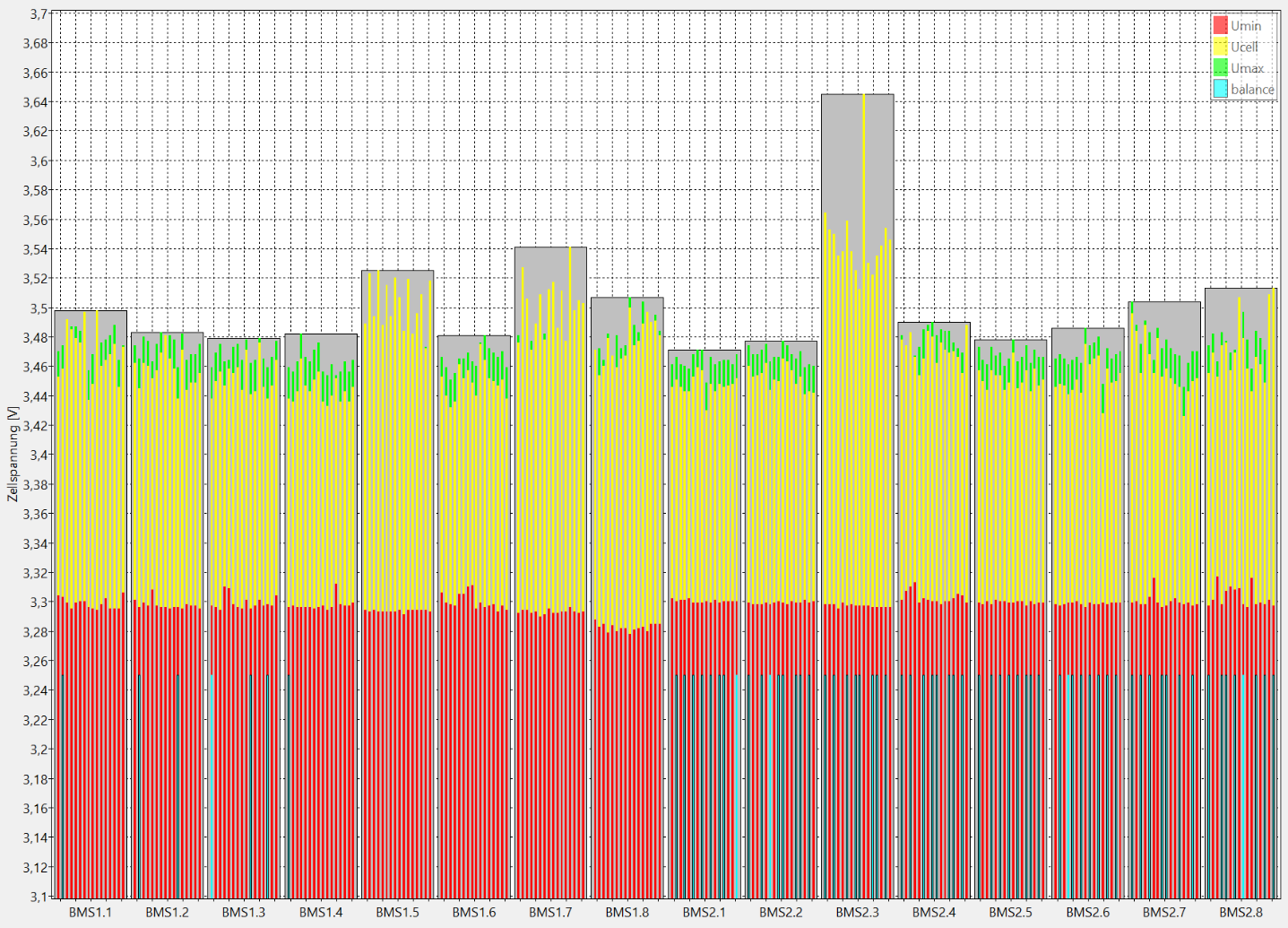 Ich hoffe, daß nicht all zu viele Leute ihre Batterien nur über 25% zyklen lassen. Das reduziert die Wirtschaftlichkeit der Investition um 75% Das ist leicht in Olli's Tool zu verfolgen: Weil der Ladestrom weg ist. Das sollte man auch beim Laden berücksichtigen, daß bei schwankender Ladeleistung (typisch bei Sonne/Wolke Wetter) im Endbereich, die Spannung der Zellen mit der schwankenden Leistung mit"schwingen". Für die BYD/Fronius Fraktion: Ein einfacher erster Check wie gut es der Batterie geht, ist es sich den Wert für den ganzen Stapel anzuschauen, bei welcher Ladeschlussspannung die Ladung beendet wird. Als Beispiel für die HVM 16.6 mit 6 Blöcken zu je 16 Zellen: Wenn jeder der 96 Zellen in der gleichen Sekunde 3,65V erreicht hat, dann ist das technisch "perfekt" - alle Zellen laufen super synchron. (Sehr unwahrscheinlich) Also ist bei einer Ladeschlussspannung von 96 x 3,65V = 350,4V alles "super optimal" Das wird in der Realität nicht zu erreichen sein, aber wenn die Ladeschlussspannung über 335V ist, ist das schon ein sehr guter Wert der zeigt, daß der Batterieturm gut läuft. Liegt die Ladeschlussspannung bei nur 325V oder noch weniger, dann ist es Zeit, sich mal die einzelnen Zellen anzusehen, ob da etwa einige Zellen auseinander gedriftet sind. Das war das Zellenbild bei meiner niegel-nagel neuen Batterie, die zum allerersten Mal vollgeladen wurde. Eine Zelle dachte besonders fleissig zu sein und hatte deutliche Voreilung. Das BMS BMS [Batteriemanagementsystem] hat gleich die Balancingmaschinerie angeworfen (die grauen Balken im roten Bereich sind Zellen bei denen das Balancing aktiv ist) Mittlerweile hat sich alles eingerenkt. Die Batterien brauchen einfach Zeit, um sich zu stabilisieren |