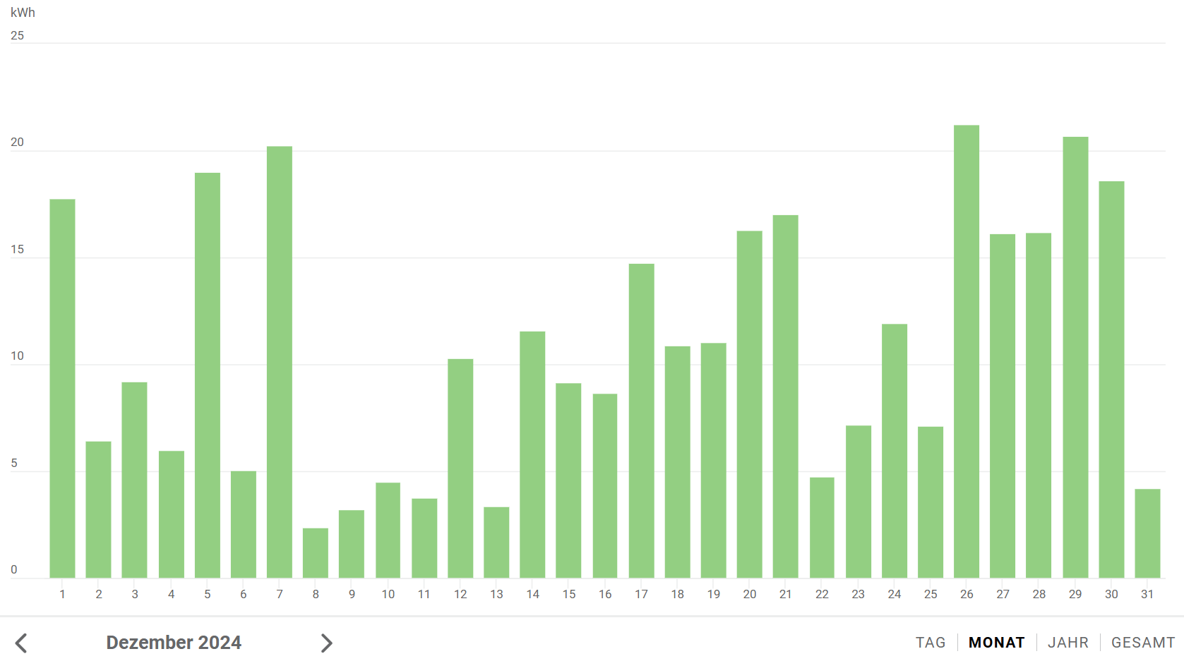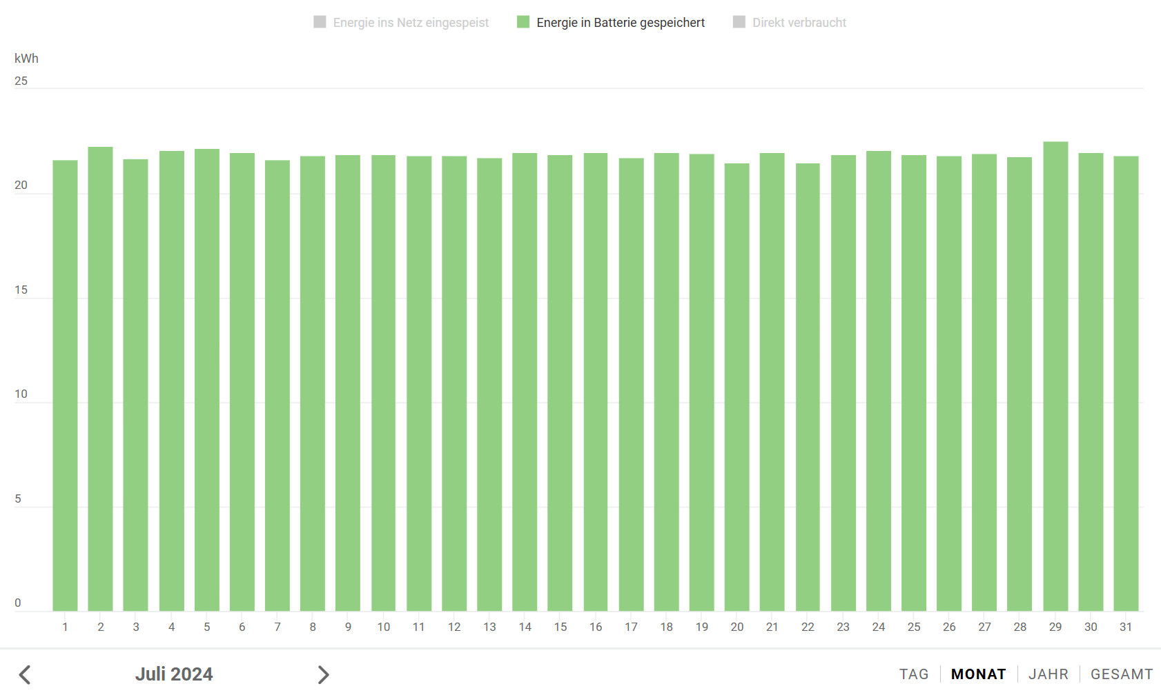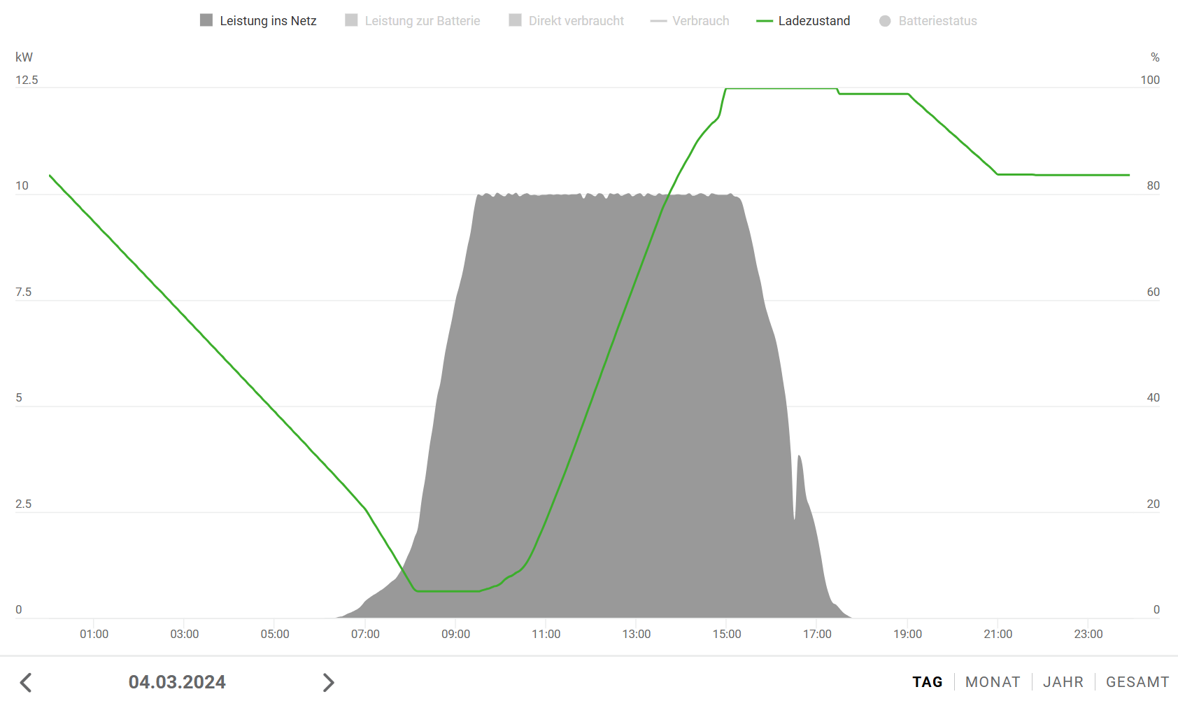 1) Ich kenn deine Anlagenconfig nicht, ob das Sinn macht. Aber ich mach das so, wann immer ab März möglich. Nur bei angekündigten Schlechtwetterperioden "zwinge" ich die Batterie auch unter dem Limit zu laden. Das schaut dann bei einer 21,6 kWp kWp [kWpeak, Spitzenleistung] Anlage mit 10 kW Einspeiselimit und 16 kW Wechselrichterleistung so aus: Das ist übrigens an solchen Tagen mit dieser Einstellung eine perfekte Ladekurve für die Batterie, da sie langsam anfängt, hoch hinaufgeht und gegen Ende langsam wieder runterkommt. Auch erfreulich: Alles was grün ist, ist zusätzlicher Ertrag, der ohne Batterie nicht da wäre. Schaut man sich die reine Einspeisung (ohne Energie in die Batterie) tagsüber an, sieht das dann so aus: Also in meinem Fall sind das 22 kWh Mehrertrag Anfang März ggü einer gleichen, aber batterielosen Anlage wenn es ein Einspeiselimit gibt. Im Jahr 2024 hat diese HVM 22 insgesamt knapp 3200 kWh Mehrertrag produziert und damit den Jahresertrag von 995 auf 1.139 kWh/kWp gesteigert. Ein Plus von 144 kWh/kWp, das auch die Wirtschaftlichkeit der Batterie positiv beeinflußt. 2) Ich habe eine EG. Da darfst du sowieso aus der Batterie ins Netz einspeisen. Sonst kannst du den anderen Verbrauchern deinen selbst erzeugten Strom in der Nacht nicht zur Verfügung stellen (Die Energiezuweisungen zwischen Erzeugern und Verbrauchern werden in 15min Zeitfenstern bilanziert). |