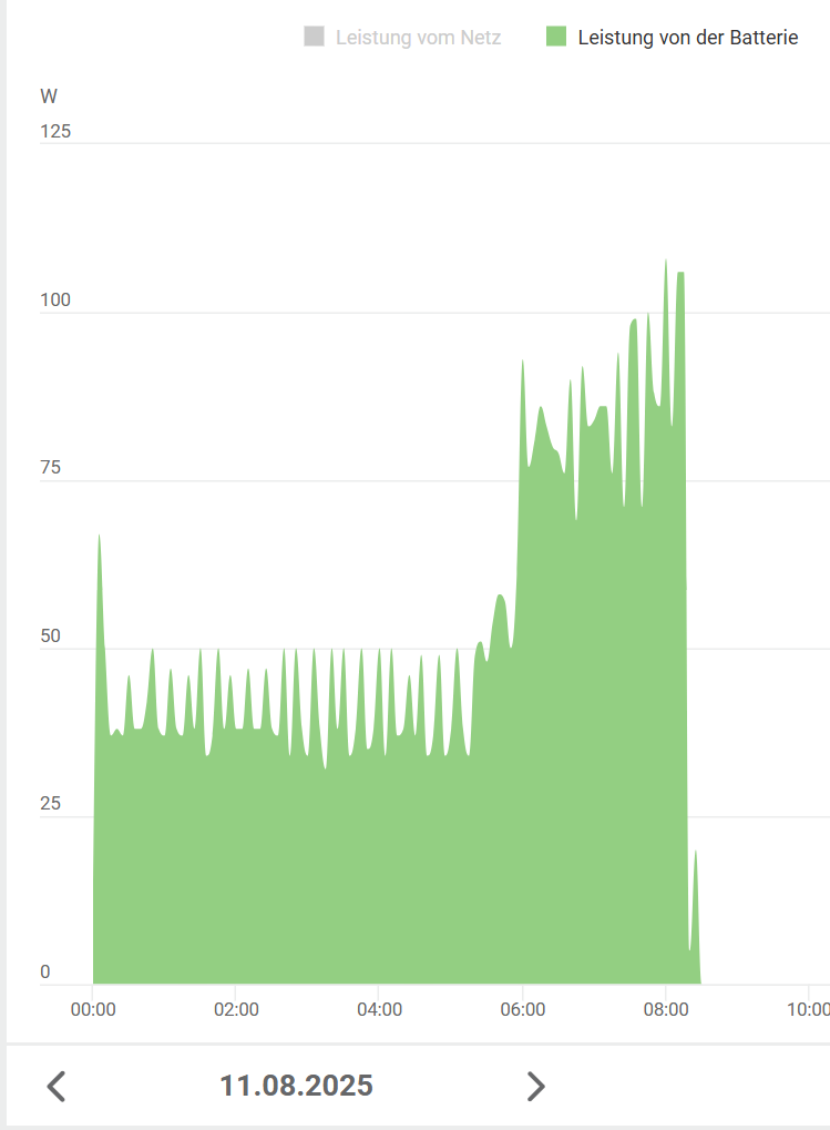 Wenn man wirklich ambitionierter Bastler wäre, würde man für den Hausverbrauch nachts einen eigenständigen Wechselrichter haben mit eben jenen niedrigen Verbräuchen, vielleicht bis 1KW pro Phase am Akku mit hohem Wirkungsgrad, damit zum einen der hohe Eigenverbrauch eines großen WR WR [Wechselrichter] nicht zum tragen kommt, und damit weiterhin gemessen und Leistung zur Verfügung gestellt wird. Bei uns läuft auch quasi nichts nachts was mehr benötigen würde. Eigentlich schade, dass es sowas nicht integriert oder als Zusatzbox für große WR WR [Wechselrichter] gibt. Also einfach einen zusätzlichen Mini-WR der dazwischen geklemmt wird am großen WR WR [Wechselrichter] und Akku/GRID/LOAD mit CT Klemmen beliefert. |