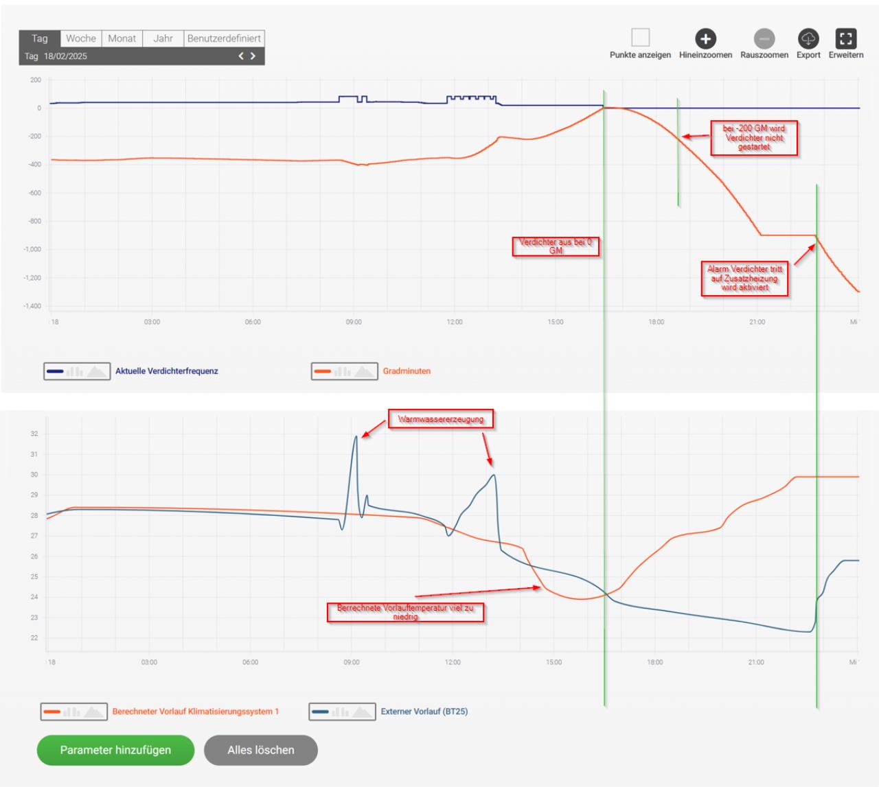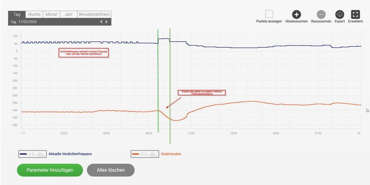 Habe mir nochmal die Verläufe der Gradminuten, Verdichterfrequenz und die Vorlauftemperaturen am Tag vor dem Ausfall (Normal) und am Tag des Ausfalls angesehen. Für mich sieht das, wie zuletzt vermutet, nach einem Steuerungs/Regelungsthema aus. Am Tag vor dem Ausfall war es so wie es normal ist, berechnet Vorlauf und Vorlauf hatten nur eine geringe Abweichung. Am Tag des Ausfalls hatte die Nibe nach dem WW WW [Warmwasser] Takt viel zu hohe GM was dann auch zum Stopp der Heizung führte (Normalerweise muss er nach dem WW WW [Warmwasser] Takt GM aufholen). Irgendwann wurde die berechnete Temperatur korrigiert und die GM sind nach unten gerasselt, der Verdichter hat aber trotzdem nicht gestartet (Einstellung -200 GM). Der Alarm Verdichterstörung kam dann erst später... Also in Summe einige für mich Unerklärliche Verhalten. OK NOK |