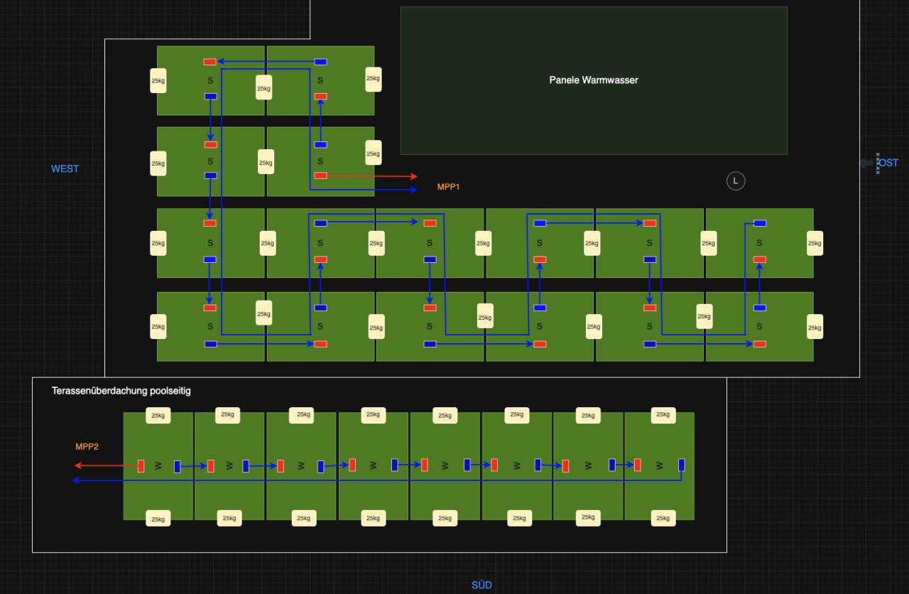 Wenn sich mit den Modulleitungen nicht mehr ausgeht, hast du die richtige Lösung. Vielleicht auch ein Grund, dass niemand sonst schreibt. Ich würde noch auf die WR WR [Wechselrichter]-Spec schauen, weil der eine String hat 8 Module, der andere 16, d.h. Minimalspannungen und Wirkungsgrade beachten. Aber es wird vermutlich an der Orientierung liegen, dass du das so wählst. |