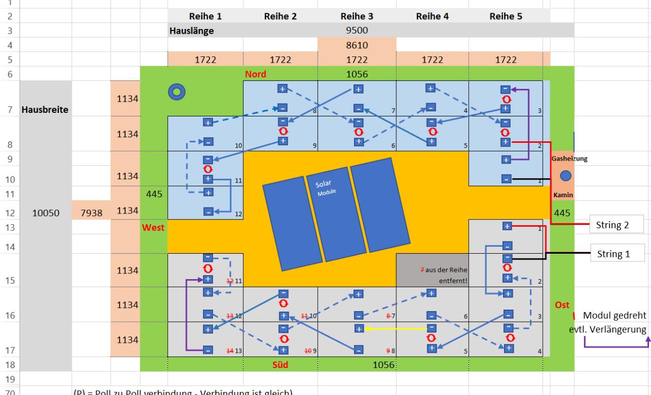 Männer, ich brauche nochmal eure Einschätzung. Habe wie im initialen Post von mir, die Strings umgesetzt und fehrlefrei gemessen. Nun stellt sich mir folgende Frage: Habe im Zuge der Installation gemerkt, dass ein Modul vom oberen String auf dem Enwässerungsdeckel verläuft und deshald das Modul kurzerhand (ohne weiter zu denken) in den unteren String verlagert. Nun, nachdem die Installation abgeschlossen ist, überlege ich genau dieses Modul 7 (im unteren String) wieder rauszunehmen. Um den Änderungsaufwand gering zu halten, wollte ich wissen ob aus Sicht der Induktionsschleifen-Diskussion, solch eine geänderte Verkabelung (vorher=rote Leiter vom Modul 7 enfernen und nacher=gelbe Leiter vom Modul 5 zu 8 legen) immer noch gut/sicher funktionieren würde. Nach Änderung Modul 7 enfernt und 5 zu 8 verkabelt. |