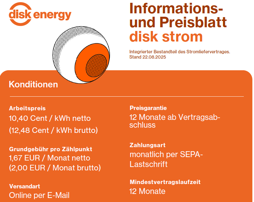 Disk hat erhöht von 10,50 (netto), auf 10,90, Grünwelt (noch) unverändert bei 10,00 (bei höherer Gründgebühr). Mein Tarif bei Grünwelt den ich seit einem Jahr habe, ist noch immer bei 9,50.