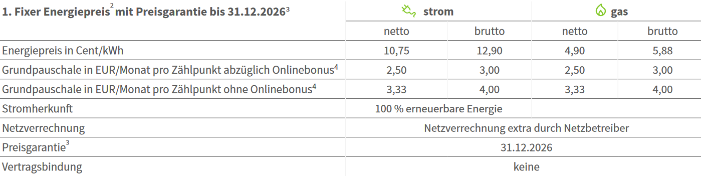 Energiepreis ab 21.07.2025 und bis auf Widerruf. Der Energiepreis und die Grundpauschale gelten auf Basis der Preisgarantie bis 31.12.2026 als fest vereinbart (kein Kündigungsverzicht).