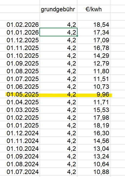 dann bekomm ich vom netzbetreiber eine eigene rechnung - der verlangt dann keine grundgebühr? was man mit einer berechnung immer bezweckt - vergleichen - und den variablen tarif hab ich erstmals nach vielen jahren gewählt, um es zu testen, wie es sich verhält und danke fürs neu aufstellen und berechnen, wir werden aber jetzt noch zuwarten, was sich in den nächsten monaten ergibt eingestiegen im variablen tarif sind wir damals im frühjahr - also wo es "günstiger " war jetzt prüfen wir wieder - evaulieren, kennen wir eh aus den medien |