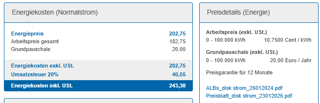 update zu montana; seit heute neuer tarif (ECO_S6052) mit 60 % neukundenschmäh und mit bindung: arbeitspreis wurde auf 23,328 cent erhöht; mit 60 % neukunden rabatt aber beim gleichen arbeitspreis brutto rabattiert geblieben. ich frag mich was bringt den anbietern diese herumruderei? das nervt mich als kunde irgendwie. |