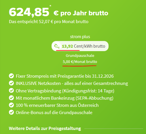 also, ich hab bei der energie steiermark den steirerstrom flex vor 2 jahren gebucht - waren jahrelang beim verbund, aber der ging uns schon so auf den wecker naja, in den 1,5 jahren der tarif im mittelwert 14,1 klar das die landesversorger für mai oder april eine senkung ankündigen, damits im sommer dann nur ja keine einspeisevergütungen bekommst - jo, was bleibt ist ein wechsel - aber wohin gogreen hab ich grad die 1.700kwh bezug eingegeben - auch rd 14cent und grundgebühr 5€ jo, wozu wechseln? einfach um den bestandslieferanten zu bestrafen - fertig, weil die wissen genau wie der hase läuft ![]() ![]() |