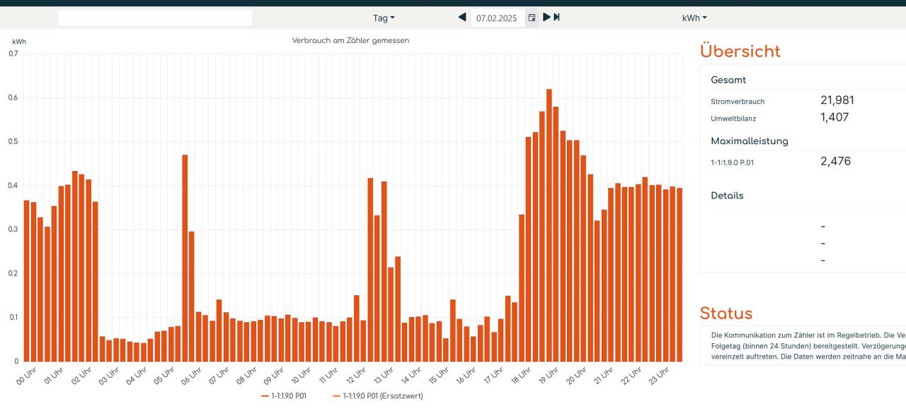 Ja, aktuell genaue Daten zu Stromverbrauch des Hauses vs. Stromverbrauch WP WP [Wärmepumpe] alleine kann ich nicht liefern. Ich werde aber heute wieder um ca. 17:30 den Stromzähler ablesen und dann kann man den Vebrauch vergleichen - dieser Zähler ist nur an der WP WP [Wärmepumpe]. Verbrauch gestern abend 17:30 Uhr war: Zum Vergleich noch ein Tag, wo man von ca. 2 bis 5Uhr die Grundlast sieht, ab 8 Uhr kommt dann Home-Office dazu, Mittagessen und am Abend wieder heizen: Wärmemenge kann ich dann auch am Abend liefern, das zeigt ja die WP WP [Wärmepumpe] an. (Dann kann ich mir auch noch die TAZ "Tagesarbeitszahl" ;) für gestern Nacht + heute ausrechnen) |