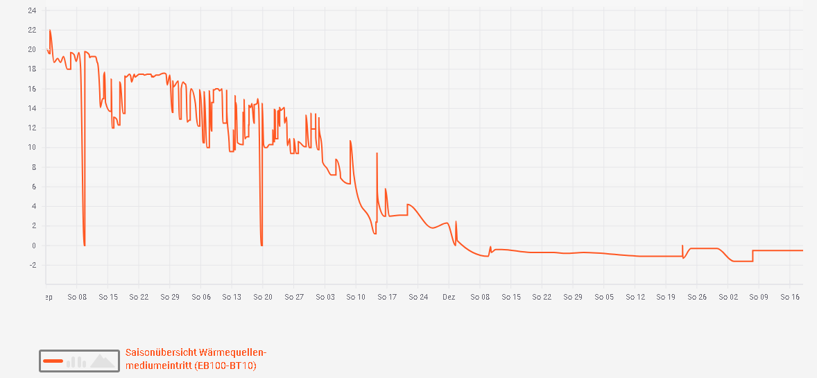 das ist falsch. -1/-4 ist genau die zielauslegungstemperatur eines RGK RGK [Ringgrabenkollektor] dort sollte der kollektor bei hoher last am winterende zu liegen kommen. warum ist das so? es ist der goldene schnitt aus aufwand & nutzen. hier greift die latentwärmenutzung als bremsfallschirm. wir haben 3 gradienten zwischen sole und erde. sole->rohr dann rohrwand dann rohr-> erde und je nach last liegen die bei 1,5-2K also im arbeitspunkt -1/-4 beginnt der gesamte kollektor die latentwärme zu nutzen... das schaut dann so aus... man sieht gut den knick, die temperaturen fallen dann nicht mehr weiter, weil eben latentwärme isotherm genutzt wird. works as designed... 50% der dreistellig RGK RGK [Ringgrabenkollektor] die wir monitoren kommen am winterende über 0° sole-ein zu liegen, 50% kommen zwischen 0 und -1° sole-ein zu liegen. geplant werden alle (von uns) gleich. der unterschied liegt dann 👉 in der bauausführung (wie bei dir) 👉 in der betriebsweise (21° oder 24° raumtemperatur) 👉 in der nutzung (garage mitbeheizt) 👉 an den jeweiligen klimadaten heuer schneiden bspwl kalte standorte besser ab als sonst und milde schlechter, weil vielerorts gefrierender nebel vorherrschende wetterlage war. rein über die außentemperaturen kann man das gar nicht darstellen...