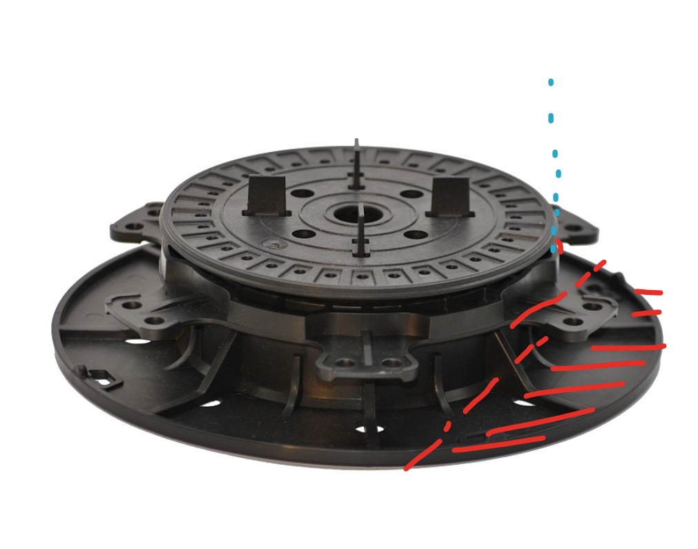 Habemus Randabschluss! ...also fast, ein paar Platten fehlen noch, aber das Wetter spielt halt grad leider überhaupt nicht mit. Zu den Stelzlagern selbst: also am Rand sollte man die wirklich gut zuscheiden und soweit wie möglich nach außen rücken, sonst kippen die Platten recht leicht. Vor allem wenn man, wei bei uns, die letzte Reihe zuschneiden muss, und die Platten etwas leichter sind. Ich hab leider kein Foto davon gemacht, aber so ca: Alles was rot ist gehört weg, dann kann man die Stelzlager fast bis an den Rand schieben. |