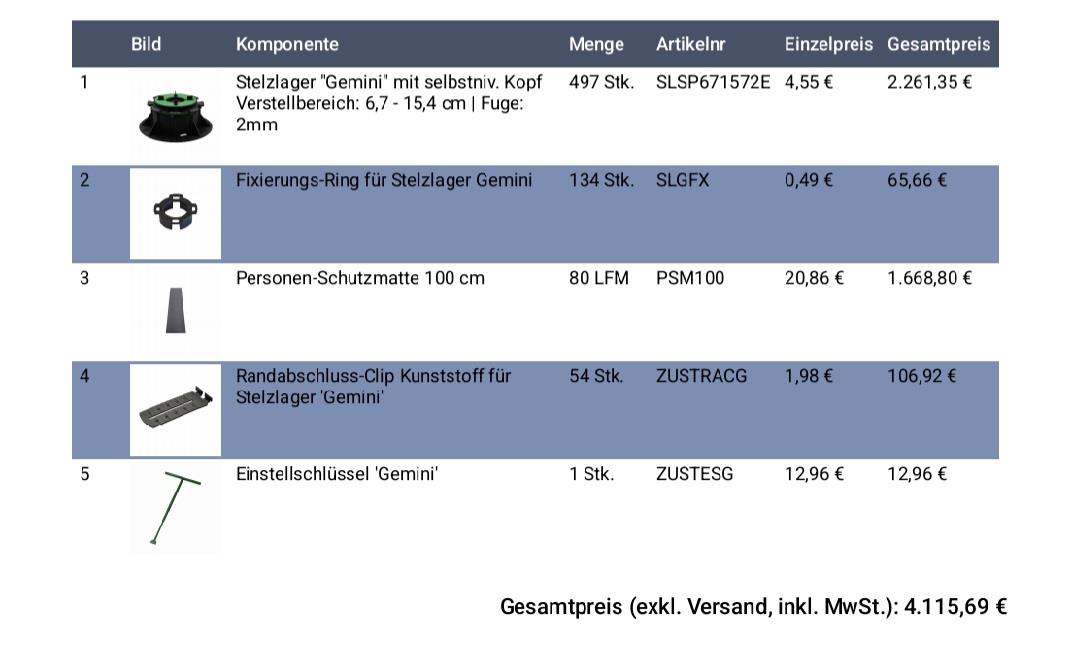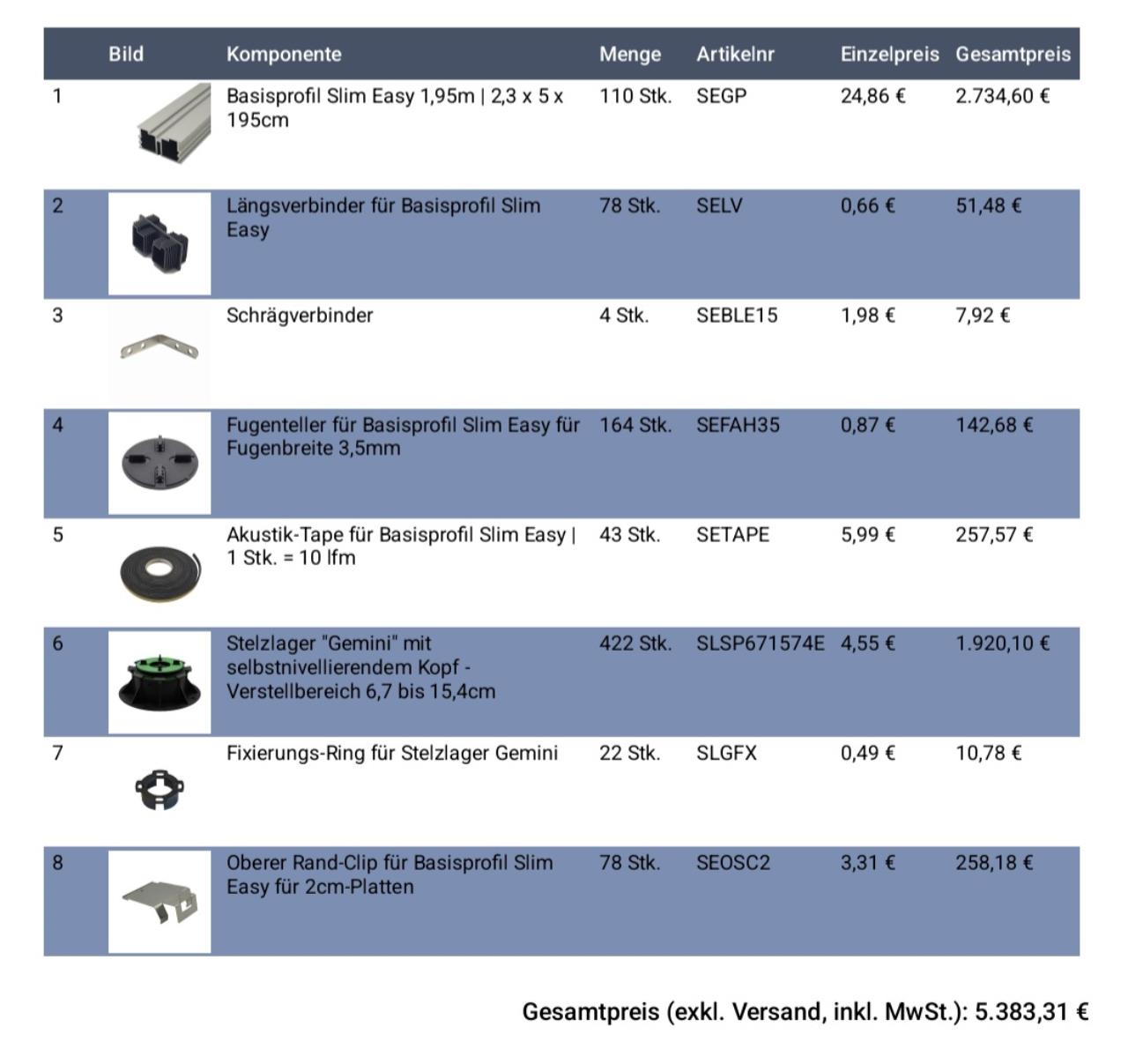 Hallo, ich möchte den Thread noch einmal hochleben lassen. Letztes Jahr ging es uns nicht mehr aus, aber für heuer bin ich fest entschlossen. Ich habe 80qm, 90x90cm Feinsteinzeugplatten und zwei Angebote erhalten: Einmal mit Stelzlager (Frage: Braucht man eine Personen Schutzmatte wie hier? Ist ja doch nicht ganz billig..) Einmal mit Schienen: Wie findet ihr die Angebote? Für welches würdet ihr euch entscheiden? "Genügen" die Stelzlager (keine hohen Ansprüche) oder doch lieber mehr Geld in die Hand nehmen und ins Schienensystem investieren? |