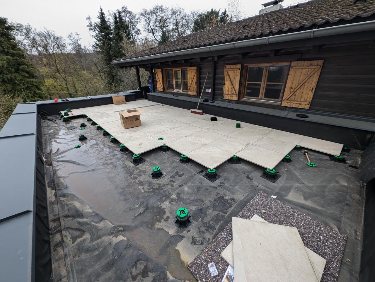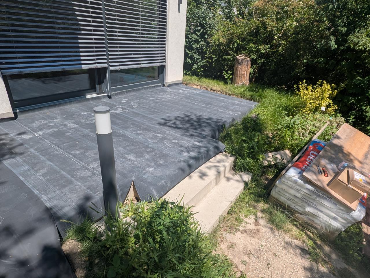 Hier Fotos von meinem zweiten Stelzenlagerprojekt ca. 60 m². Die ganze Betonterrasse hab ich mit EPDM Folie ausgelegt, da das Gefälle weg vom Haus an manchen Stellen zu gering war und Wasser am Beton stehen blieb. Zur Fassade hin wurde die EPDM Folie 10 cm hochgezogen und mit EPDM Kleber verklebt. EPDM Folie: Beginn des Plattenlegens: Eisenwinkel als Einfassung wurden in den Beton geschraubt, damit die Platten nicht nach außen wandern können. Rundherum um die Terrasse wurde drainagiert mit Vlies und Schotterkoffer. Fertig: |