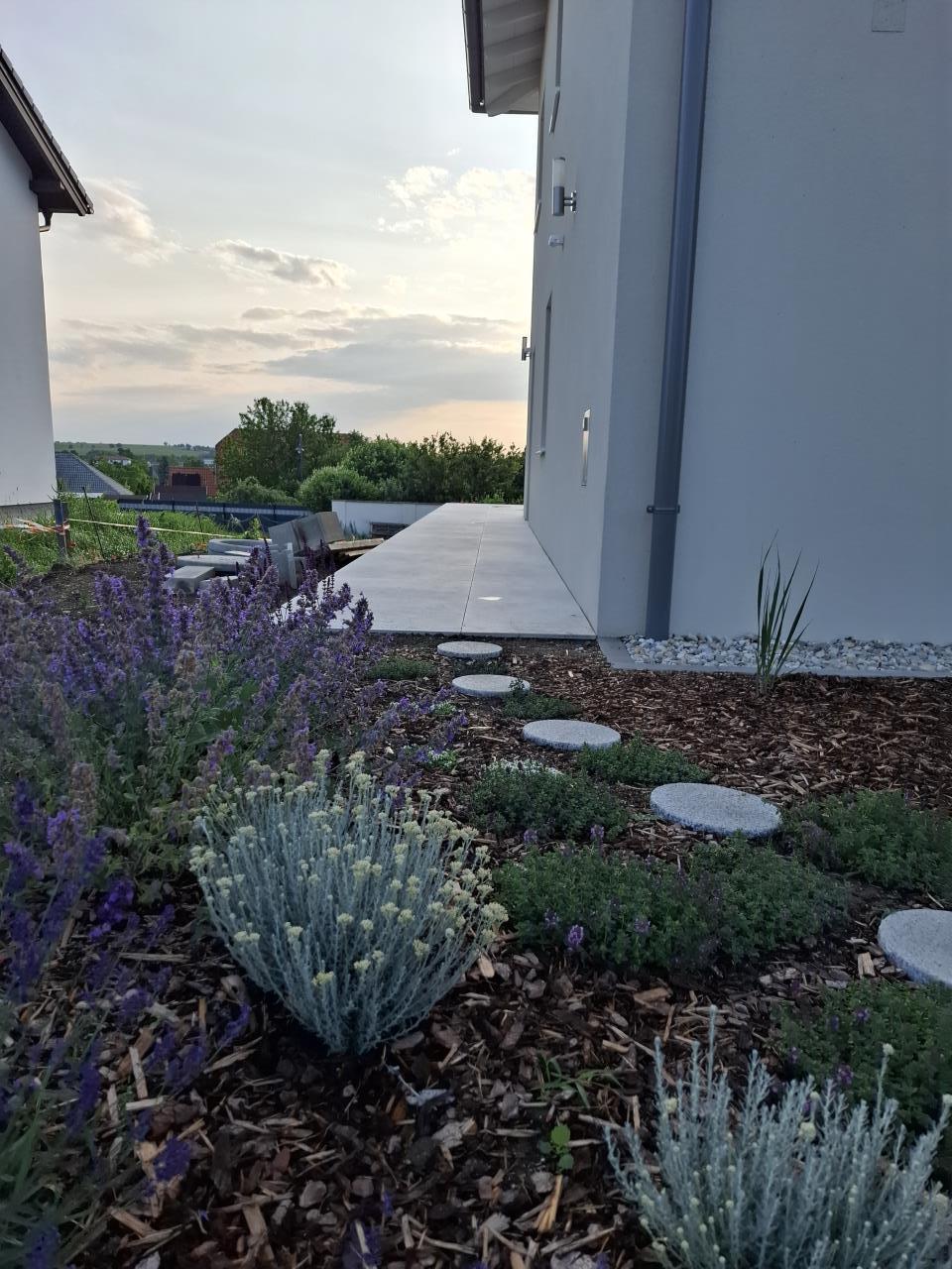 Im Herbst haben wir noch die Terrassenüberdachung gemacht, dafür habe ich dort, wo die Steher montiert wurden, die Platten einfach enfternt und zugeschnitten. Das ging mit den Stelzlagern recht einfach. Mittlerweile sieht es übrigens so aus: Würde ich es nocheinmal so machen? Jein. Ja, weil man es alleine machen kann und es richtig leicht zu verlegen geht. Nein, wenn man jemanden zur Hilfe hat. Dann würde ich eher die Splittbett bzw. Drainbeton Variante bevorzugen.