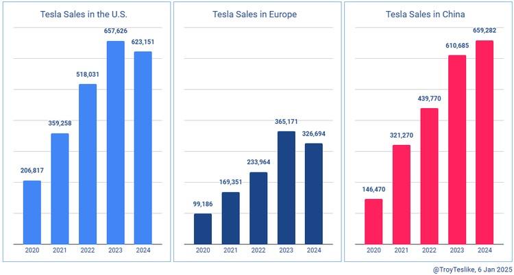 ja, das Thema hatten wir doch schon ein paar mal. Tesla hat 2 Modelle mit hohen Absatzzahlen (Y/3), nach Hersteller siehts natürlich gleich ganz anders aus. Selbst bei E-Autos hat Tesla den ersten Rang mittlerweile verloren an BYD. Davon abgesehen, dass sie weit entfernt sind von ihrer Vision der jährlichen zweistelligen Wachstumszahlen. naja 200k im ersten Quartal ergibt 800k im Jahr hochgerechnet. Ich bezweifle jetzt einfach mal stark, dass das ein linearer Trend wäre nach der Markteinführung sondern relativ rasch wieder abflauen wird nach den Nachholeffekten. Vermutlich wird es also ein einstelliges Wachstum sein heuer in China. (600-700k) Das kann also die Einbrüche bei den Verkaufszahlen in Europa nicht kompensieren und wie gesagt, es geht nicht nur um absolute Zahlen sondern auch Margen. Aber auch das Argument die Einbrüche in den Verkaufszahlen wären nur durch das Facelift bedingt... 2023 in der selben Situation beim Model 3 wurden während dem Abverkauf (und den gibts seit Monaten beim Model Y, siehe Zinsaktionen oder aktuell das MYP um 50,5k) die Rekordwerte beim Model 3 erreicht. Ein MYP um 50,5k, das bekommst in der Größe und der Leistung aktuell bei keinem anderen Hersteller. Und trotzdem brechen die Absätze ein...also das Argument zieht nur bis zu einem gewissen Grad. Heute hat sich ja auch der Kurs von Tesla korrigiert. Wir sind jetzt beim Kurs von vor der US Wahl angekommen. Bin gespannt ob wir die 200 noch fallen sehen. Die Einschätzungen deuten auf eine Fortsetzung der Talfahrt hin. Die News sind voll mit Kritik an Musk, und das nicht nur im europäischen Raum. Deine These wackelt heftig lieber Miike ;) |
