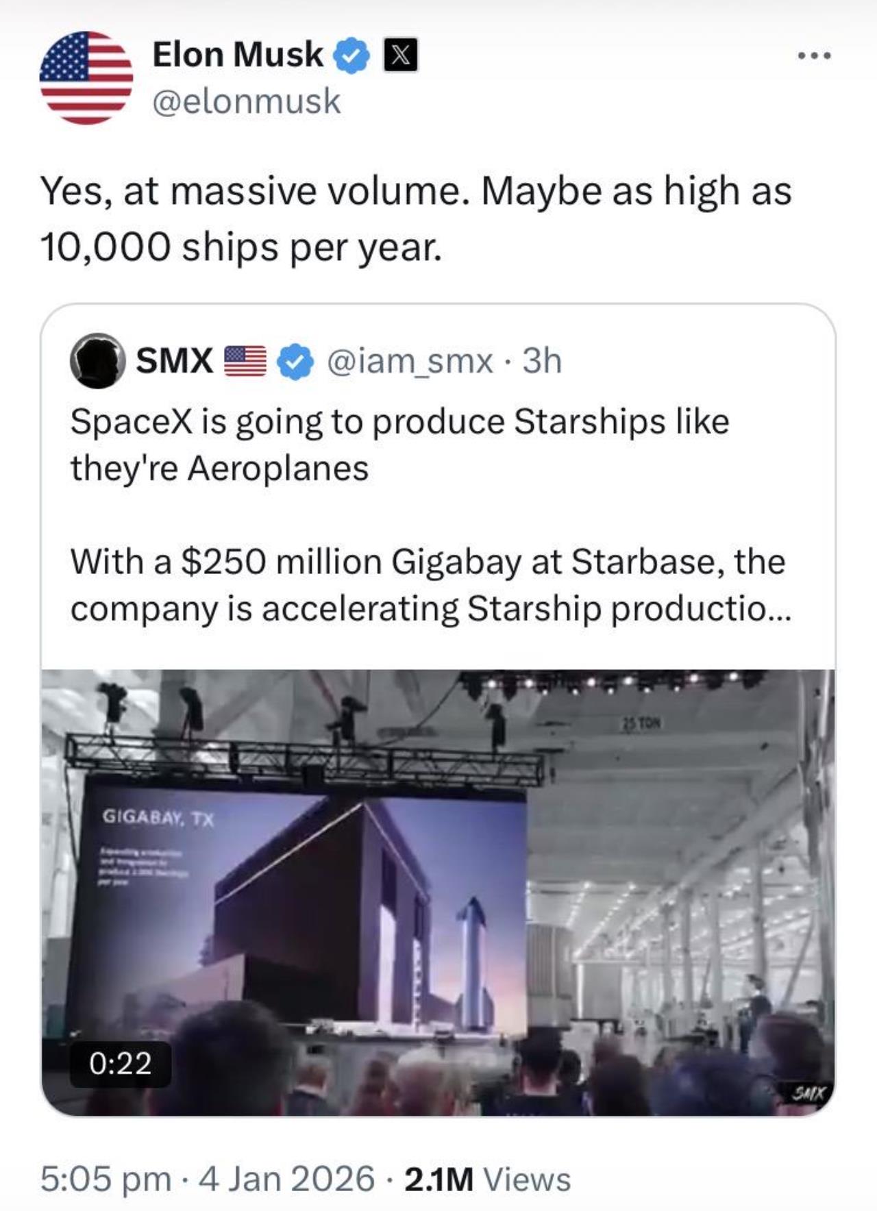 Noch schnell die Leichtgläubigen mit Schwachsinn versorgen, damit die IPO ja gut geht. Selten so einen BS gelesen wie von dem Typen. Obwohl....seine schwachsinnigen Ziele für 2025 hat er ja auch Mal wieder nicht erreicht (AGI, Robotaxis in ganz USA, autonomes Fahren im Sommer, Mars, Roadster, und natürlich das ganze DOGE Debakel bei dem nichts eingespart wurde). Also insofern ist ja seine Vorhersage, dass da mal mehr als 1 Rakete pro Stunde produziert wird (bye bye Klima, es war schön mit dir) ja erfrischend "realistisch" |