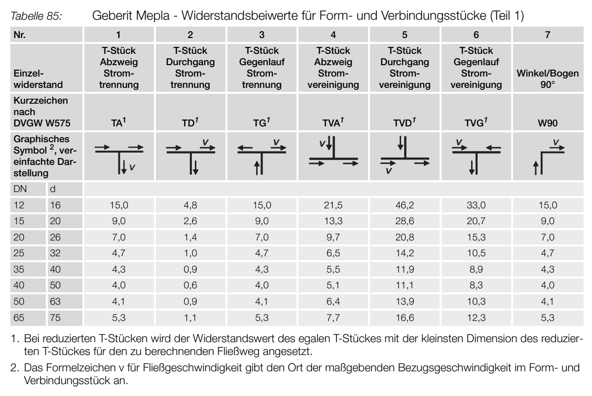 Ja, nur sind alle Werte mit 10 zu multiplizieren. Der 90° Winkel hat demnach ein Zeta von 13, was aufgrund der massiven Querschnittsverengung auch nicht verwunderlich ist. In der Tabelle wird leider nicht angegebn welcher Querschnitt für die Berechnung herangezogen wird. So sieht das z.B. beim Geberit Mepla aus Der Zeta-Wert beträgt für einen 90° Bogen beim 16 Rohr z.B. 15. Für die mittlere Geschwindigkeit des Wasseres ist jedoch DN12 für die Berechnung heranzuziehen. |