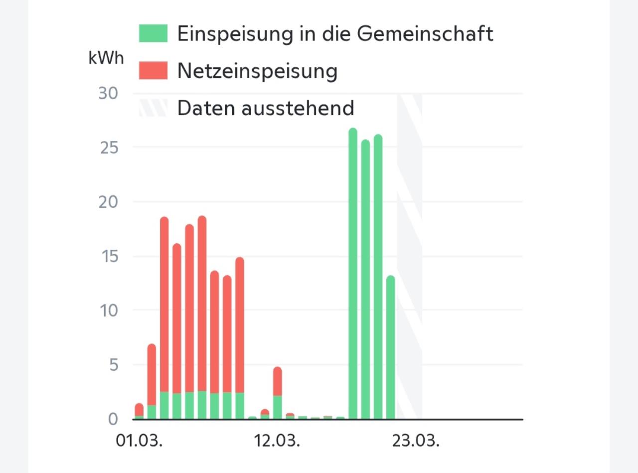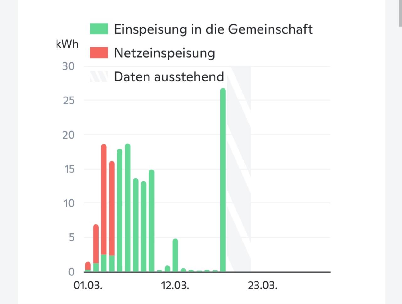 Aktuell sind die Daten vom 05.03. drin. Also 20 Tage ca. sind sie "hinten". Jedes Folgemonat wird dann abgerechnet auf das Depot. Dort steht dann entweder ein Minus wenn ich bezogen habe oder ein Plus wenn ich eingespeist habe, wird automatisch gegengerechnet und den verfügbaren Betrag kann man entweder auszahlen oder man muss was einzahlen. |