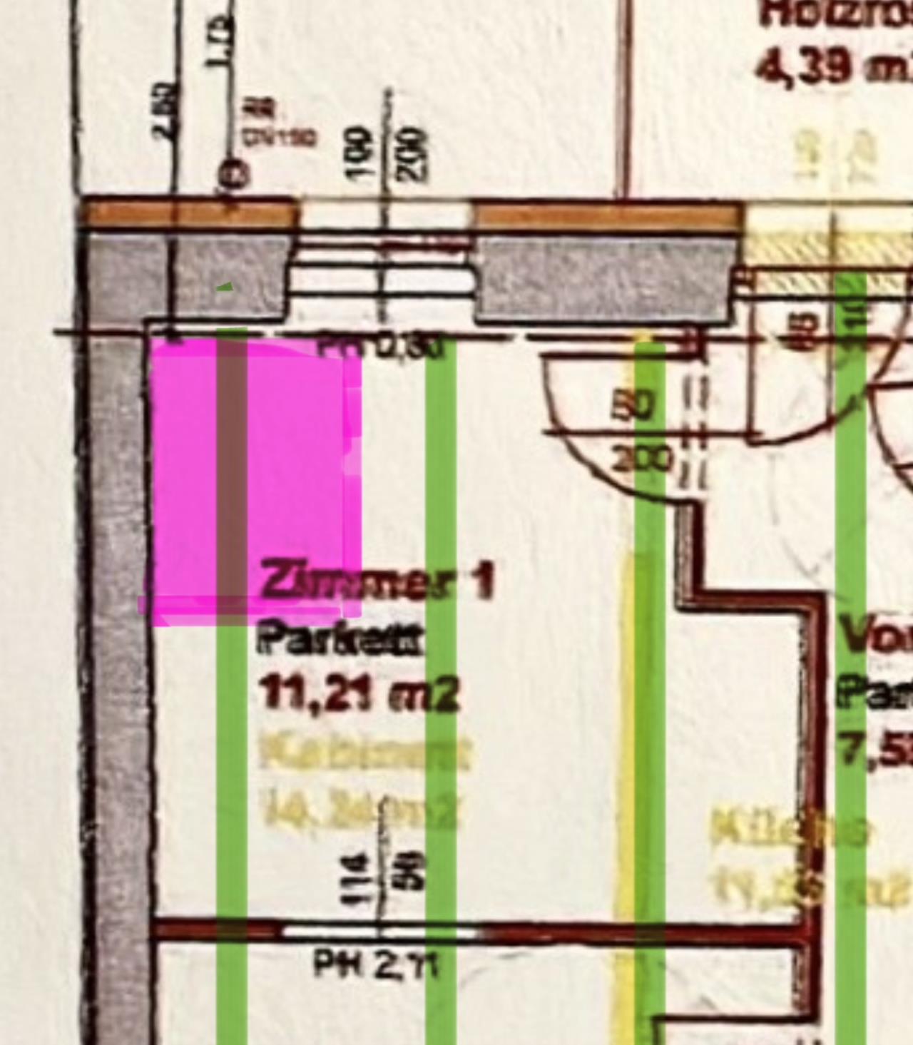 hab jetzt mal die Balkenlage ermittel und die Stellfläche in lila eingezeichnet. Durch die Dielen verteilt sich das Gewicht ja noch über die Stellfläche hinaus, ich glaube das ist schon ok so.
