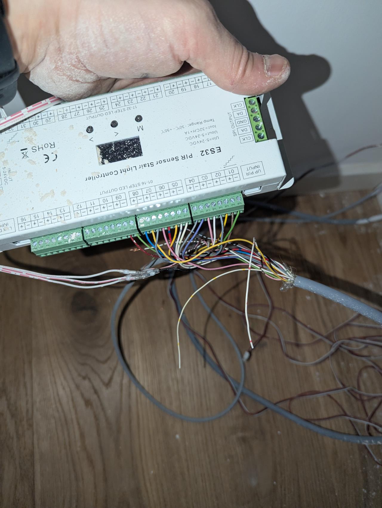 Danke. Die Spiegel sind aus MDF, kommen auch von INKU. Allerdings sind dahinter keine Kabel... Ich habe einen Schlitz in den Putz seitlich der Stufen gestemmt und an einer Stelle der Treppe ein Loch, entweder in einen nebenliegenden Raum oder in den Raum unter der Stiege gebohrt und da alles Kabel durchgezogen. Damit das ganze nicht zu dick wird habe ich eine Steuerleitung mit 20 Adern und eine mit 6 Adern genommen. Jede Stufe hat logischerweise 2 Adern. Die Bewegungssensoren oben und unten jeweils 3 und der Lux Sensor 2. Unten ein Foto von den Kabeln beim verlegen. Und vom Controller. Beim Stufen setzen muss man dann aufpassen, dass jeweils die 2 Adern an der Treppenstufenkante rauskommen. Dafür habe ich so elektrokabel fixiert Nägel benutzt und die Kabel mit Lutz erstmal an der richtigen Stelle"festgeklebt" bevor der ganze Putz drauf kam. Wenn jemand noch Steuerleitung braucht, habe noch einige Meter übrig 😅 |