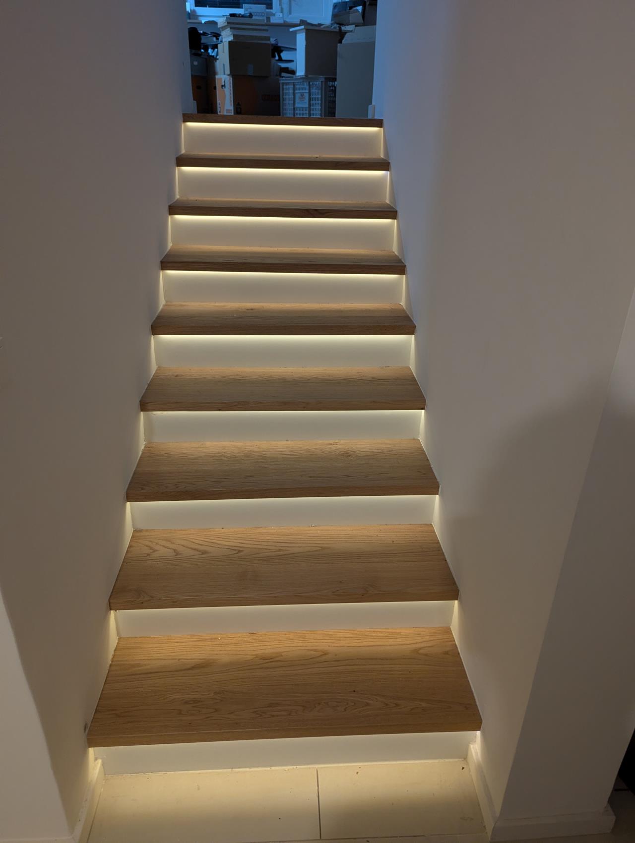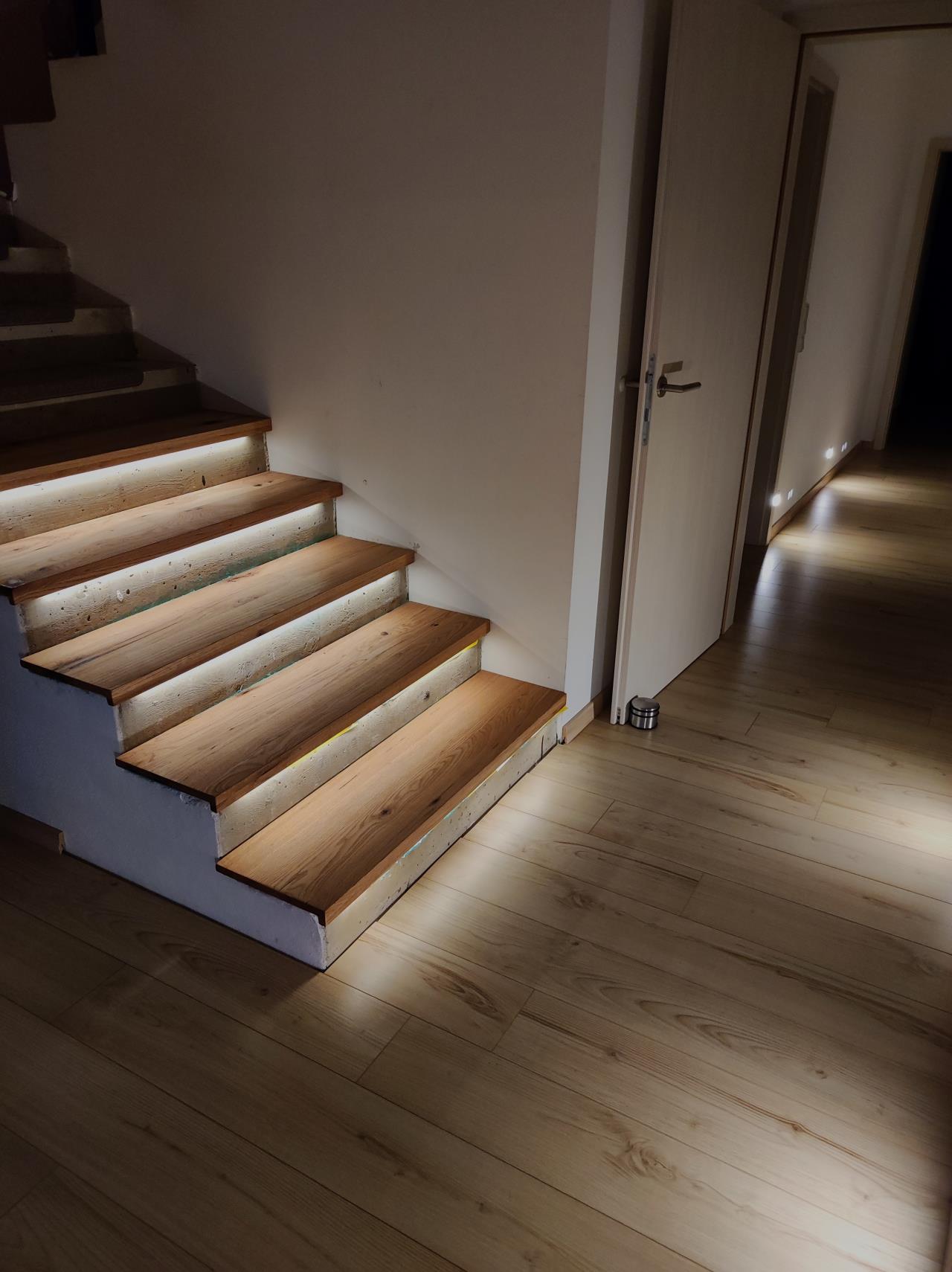 Ich habe Pautix COB LEDs mit 2700k in warmweiß vom großen A genommen. Die Steuerung übernimmt ein Controller. Bei dem sind Bewegungssensoren oben und unten sowie ein LUX Sensor angeschlossen. Über den kann ich auch die Helligkeit einstellen und dass die Treppen nacheinander angehen oder alle gemeinsam etc... |