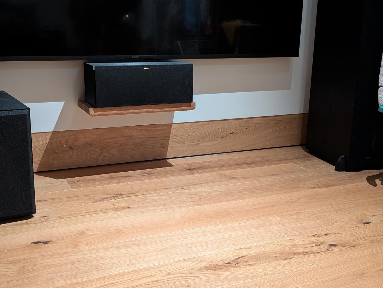 Ich habe einen großen Kabelkanal eingestemmt, genetzt, überputzen lassen und dann mit einem Dosenbohrer oben und unten jeweils ein Loch gebohrt. Alle Steckdosen sind in Standardhöhe hinter einem Lowboard versteckt, in dem auch die sonstige Multimedia-Technik untergebracht ist. Zu den Lautsprechern habe ich normale Elektro-Panzerschläuche Unterputz verlegt, die in eine Zugdose ebenfalls hinter dem Lowboard münden. |