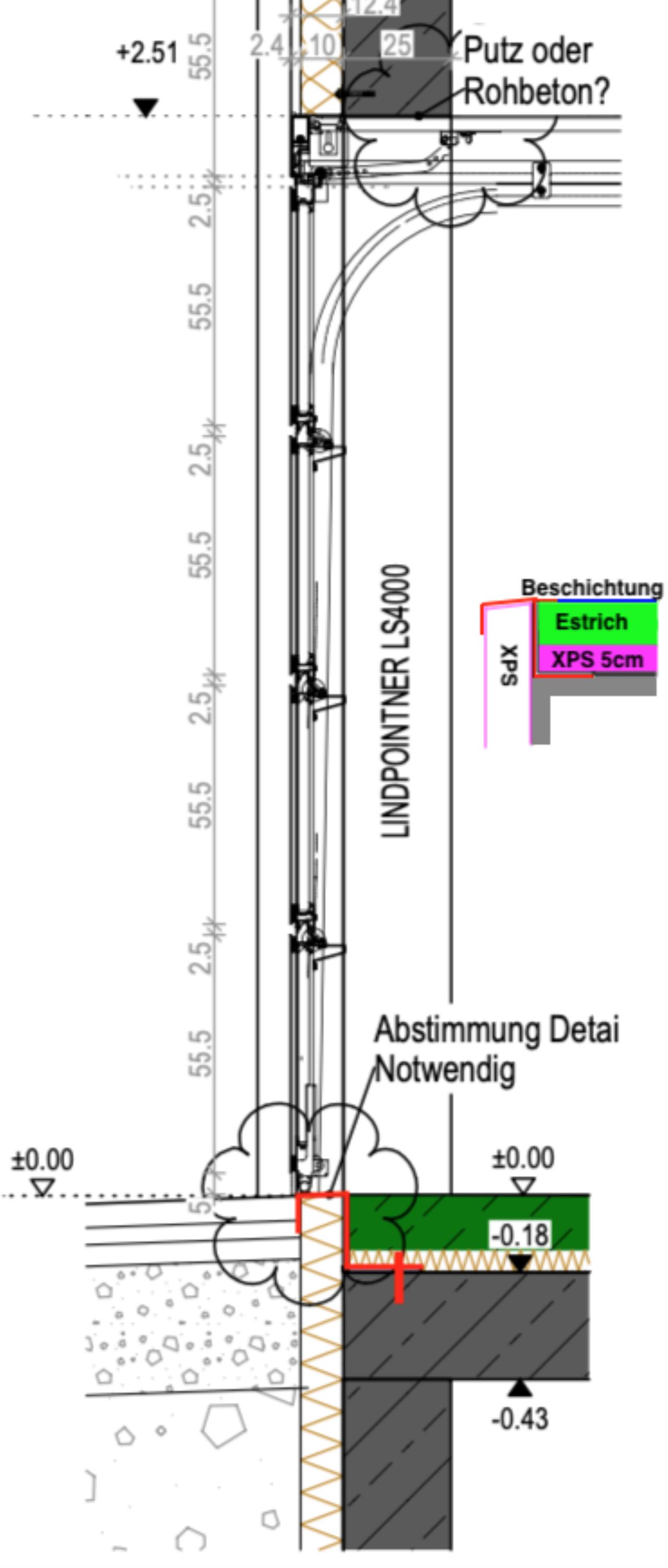 Entsp. der Zeichnung hat der "Estrich" in der Garage eine Dicke von ca. 12/13cm. Genaugenommen spricht man dann von einer Lastausgleichs- bzw. Betonplatte. Du könntest die Lastausgleichsplatte über die vertikale Wanddämmung bis zum Pflaster ausbilden und einen Edelstahlwinkel mit ca. 5/5cm an der Kante mit Schrauben verankern. Wir haben den Winkel (A4) mit Senkkopfschrauben, ebenfalls A4, vertikal und horizontal durch Einbetonieren mit der Platte fixiert. Die Betonplatte sollte entsp. bewehrt werden. |