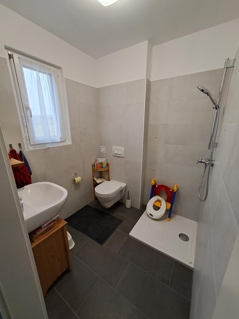 Streu noch Salz in meine Wunden 🤣 Ich weiß, haben wir nicht bedacht... Das hätte das Problem aber nicht unbedingt behoben, da das Wasser auch an die Wand spritzt und dort runterrinnt. Ich hab nachgemessen, das spritzt in etwa bis 1,5m... Wir hatten das ursprünglich so geplant, uns aber dann nach ein paar Test dann doch umentschieden. Die Tasse ist sehr angenehm muss ich sagen, sie wird auch schnell trocken. Wobei wir nach jedem Duschgang alles abziehen (auch die Tasse). Danke! Ja wir sind eher simpel und funktional unterwegs. Designerzeug findet man bei uns nicht. Die Fliesen finde ich sehr sehr schön, die hatte unser Anbieter sogar im Standard mit dabei (Marazzi Appeal White und Anthrazit, 60x30cm). |